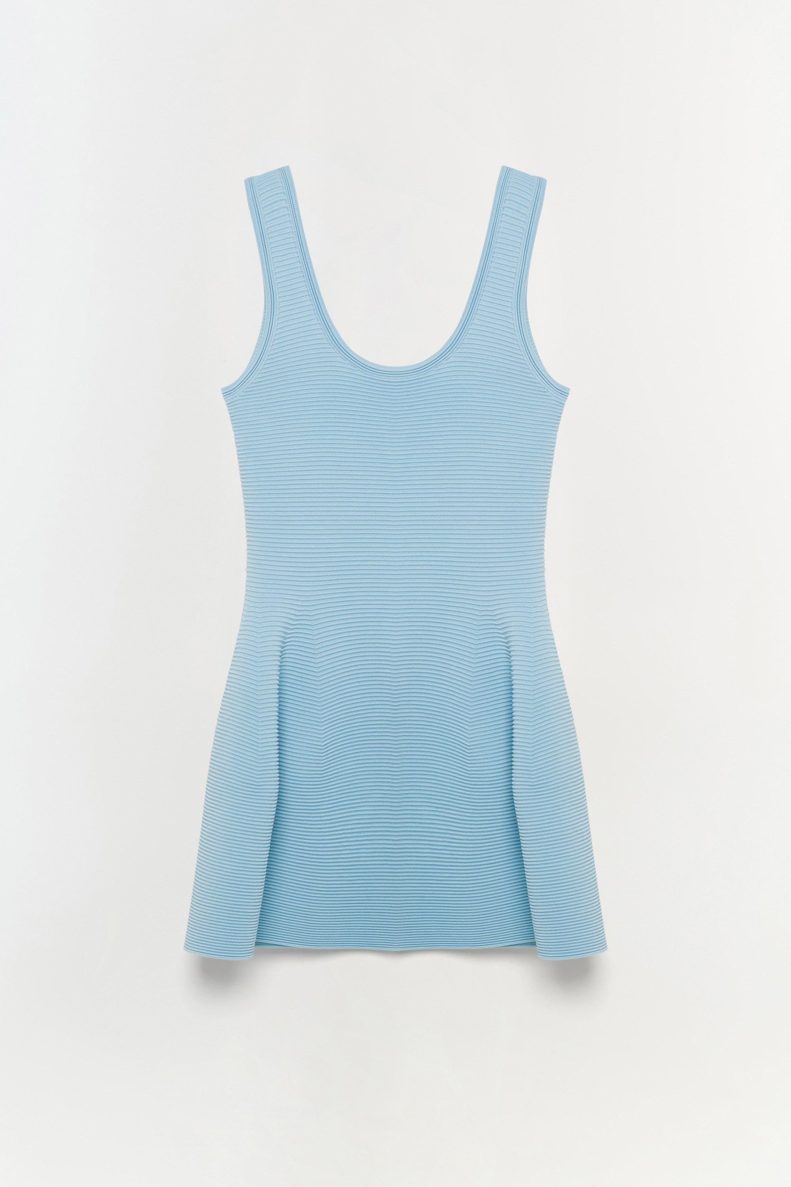 The Larina Dress in Azure Sky. Crafted from matte compact fabric, this mini features a sculpted bodice and a flared skirt for a structured yet effortless silhouette.