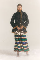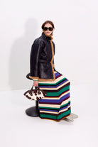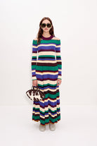 Maxi-length long sleeve knit dress featuring multicolor tropical stripes. Designed with a fitted bodice and pleated skirt for a flattering drape below the waist.