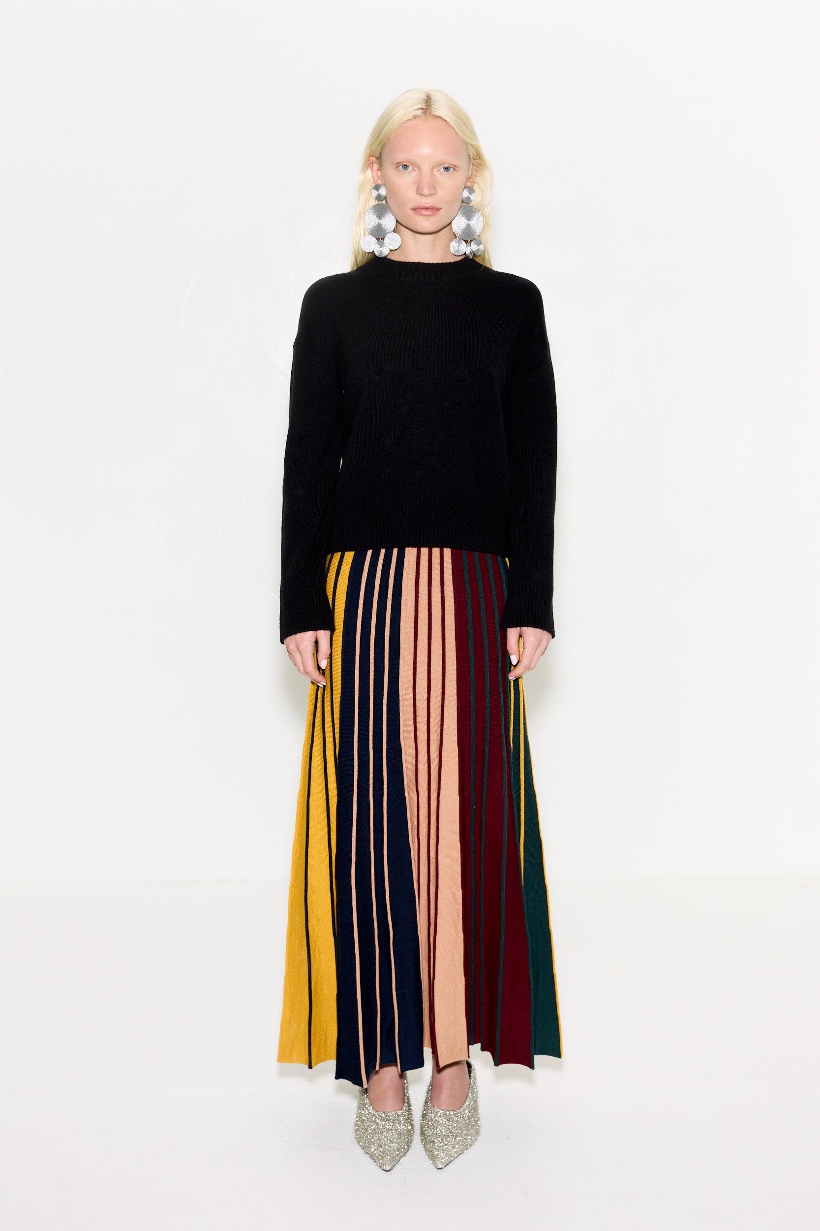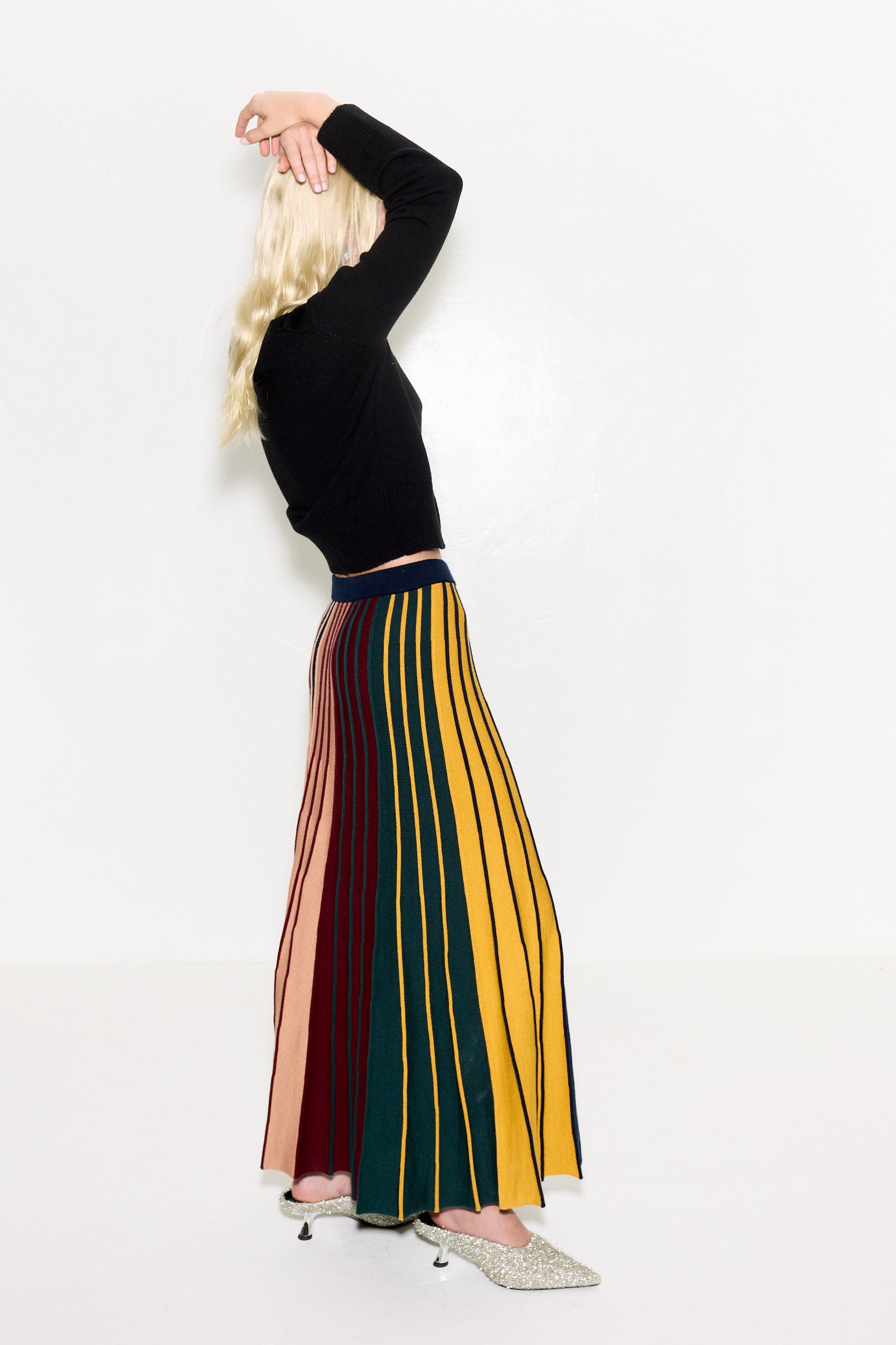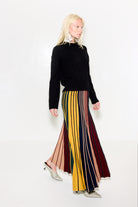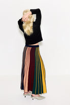 MIDI LENGTH KNIT SKIRT IN A CUSTOM SIMON MILLER DISTORTED RIBBED STRIPE. A-LINE FIT