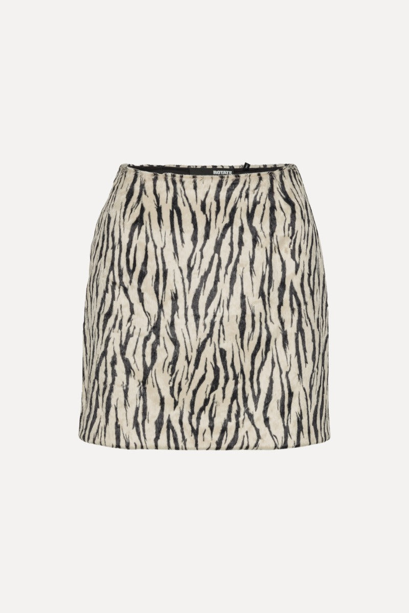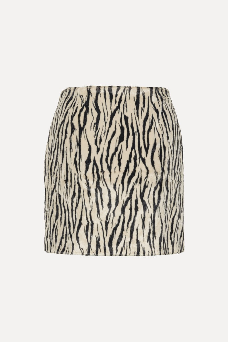 PRINTED FAUX FUR SKIRT BLACK PRINT FEATURES A HIGH-WAISTED SILHOUETTE WITH A FITTED SHAPE THROUGH THE HIPS. THE HEMLINE FALLS TO A MINI LENGTH WITH A CLEAN FINISH. A CONCEALED BACK ZIPPER ENSURES A SECURE FIT.