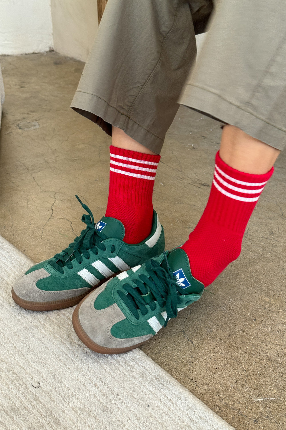 These beauties feature a triple contrast stripe at the opening and a shorter classic crew sock length. She is a universally quintessential sock and especially flattering for our petite ladies.