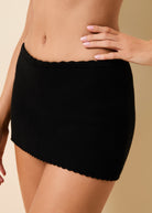The Celeste Skirt in Noir offers a sleek, modern update to the classic short silhouette. This micro-mini skirt includes built-in engineered knit shorts made from a soft cotton-knit blend with reverse jersey fabric for added comfort. Finished with a scalloped hem and waistband, it combines style and function in a versatile piece.