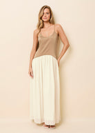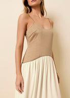 This dress features a softly structured bodice and a textured overlay skirt. A curved waist seam and gathered skirt create a romantic silhouette, while adjustable straps and a low scoop back add feminine detail. Finished with side bust darts, an invisible side zipper, and a rolled baby hem.