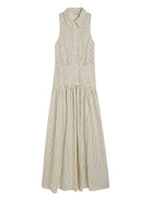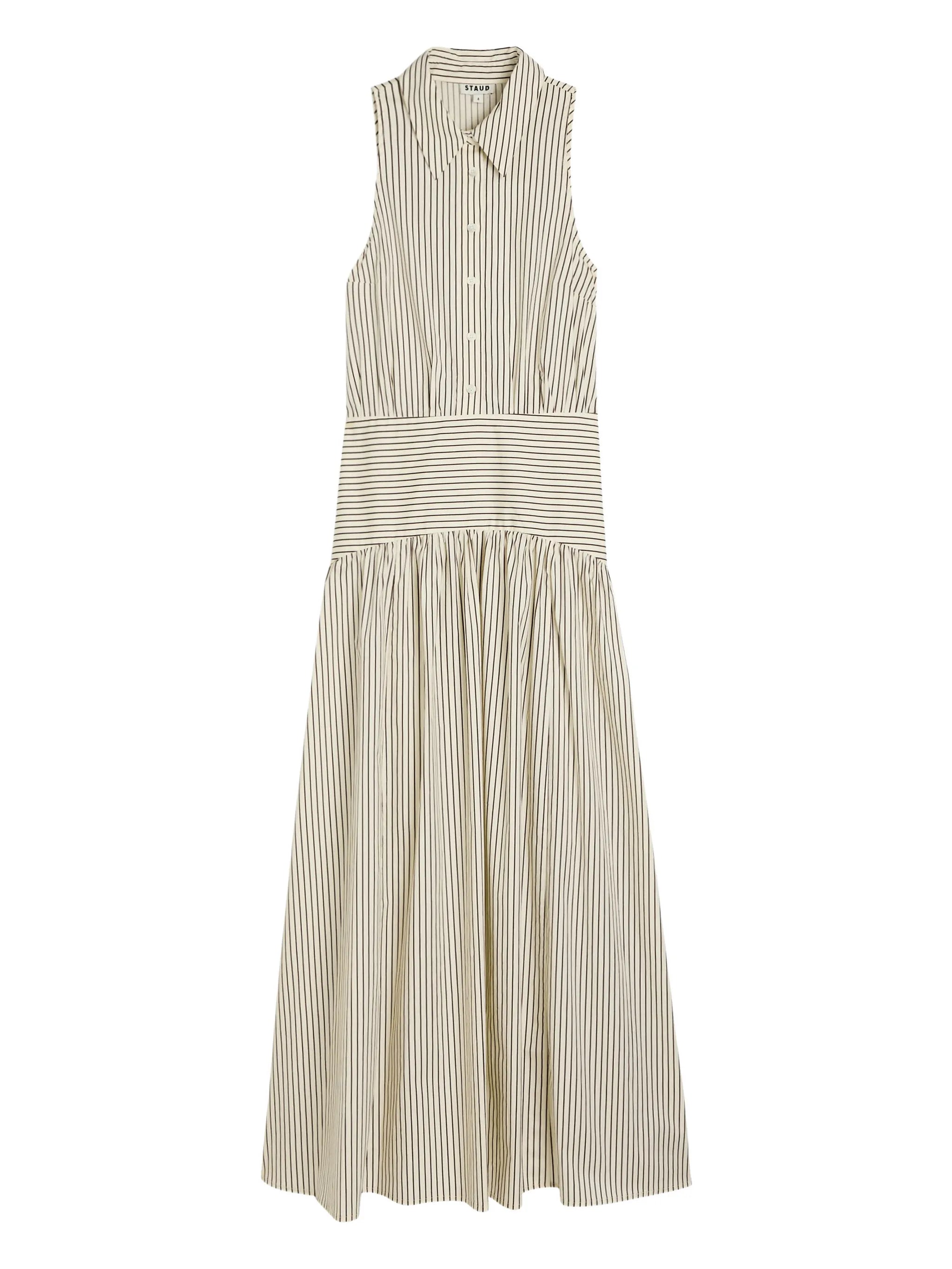 The Romy Dress is a sleeveless update to our best-selling Rocco Dress; featuring a classic collar and front button detail, this style has slight ruching at the waist and a curved yoke detail at the hip.