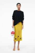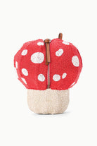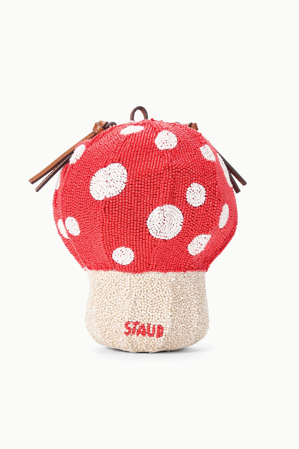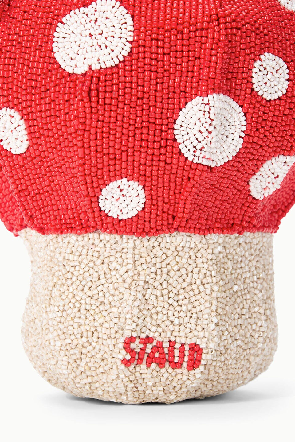 A hand-beaded handheld bag with detachable crossbody strap, the Shroom features a leather-wrapped handle and zipper opening.