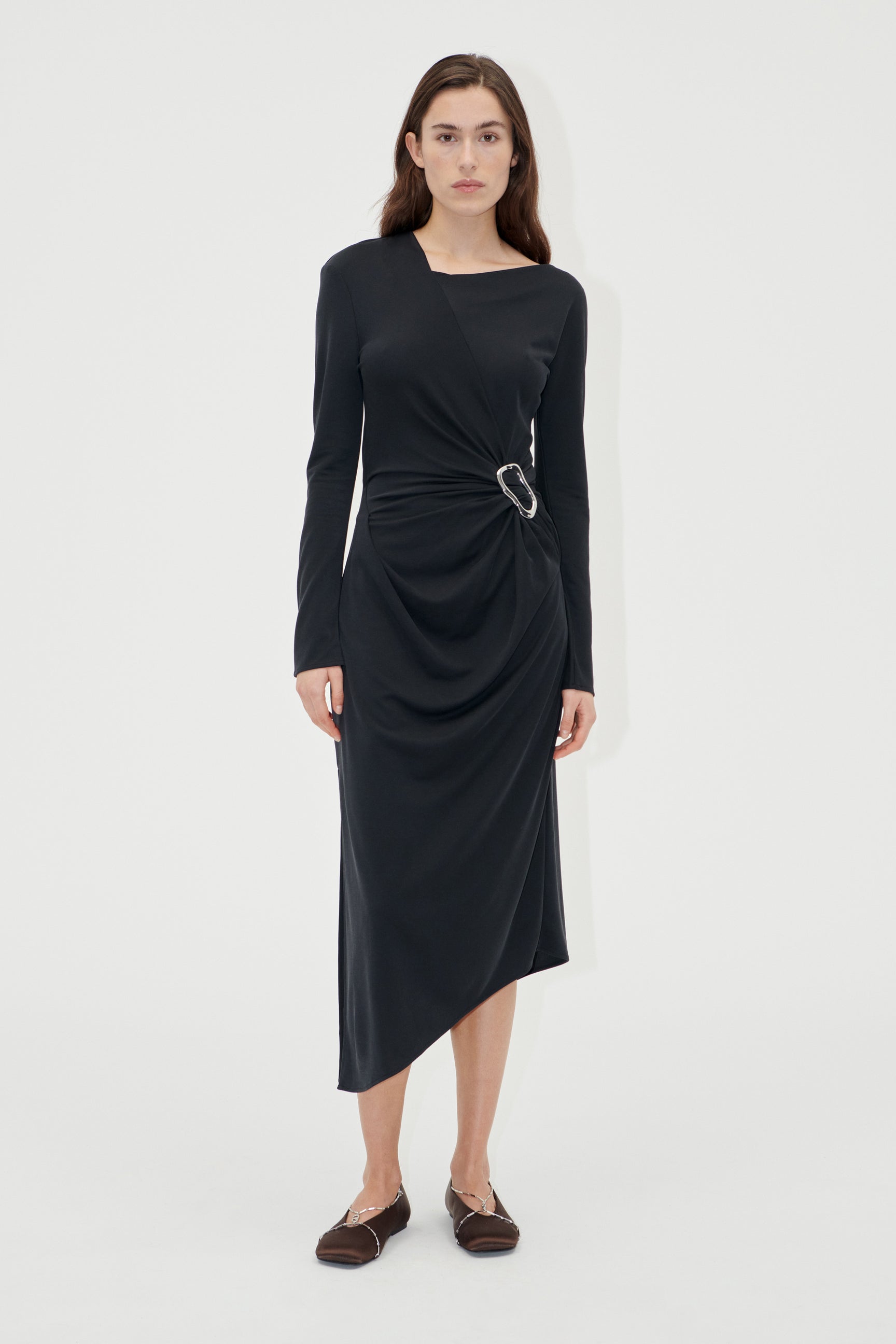 Slim midi dress with an asymmetrical  neckline and hem, featuring a silver buckle and elegantly draped waist.