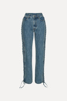 LACED STRAIGHT LEG JEANS BLUE HAVE A MID-RISE WAIST WITH A CLASSIC FIVE-POCKET DESIGN. THE STRAIGHT-LEG SILHOUETTE FEATURES BRAIDED LACE-UP DETAILING ALONG THE SIDE SEAMS, SECURED WITH METAL EYELETS AND FINISHED WITH ADJUSTABLE TIES AT THE HEM. A ZIP FLY WITH BUTTON CLOSURE AND BELT LOOPS COMPLETE THE DESIGN.