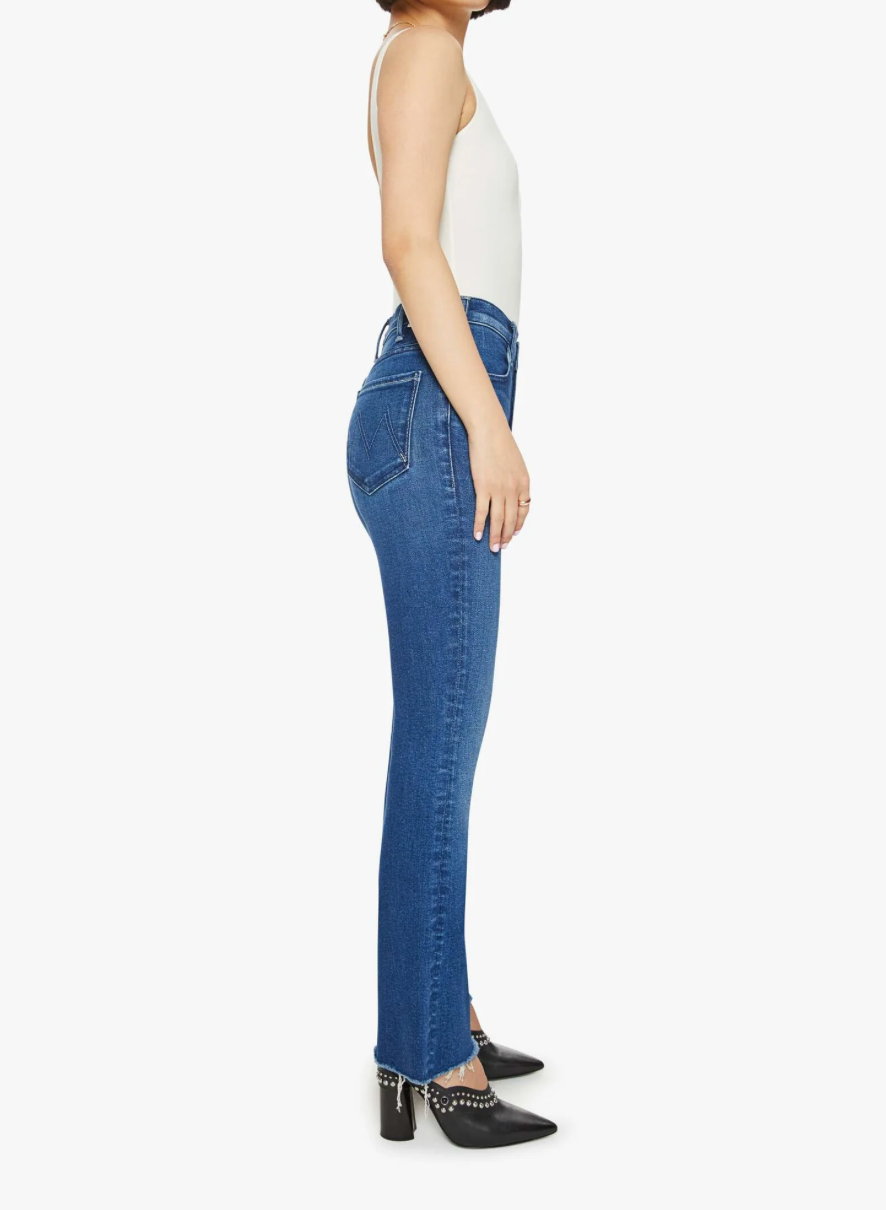This high-rise bootcut has a 26.5-inch inseam and a frayed hem. Made from stretch denim, Whatever You Want is a dark blue wash with super-subtle whiskering and fading.