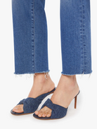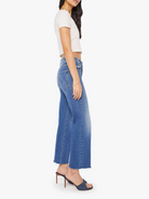 Bench warmers. Mid-rise jeans with a wide straight leg, zip fly and frayed ankle-length inseam. Made from stretch denim, Dugout Doobies is mid blue with whiskering and fading at the knee.