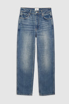 The Vin Jean features a unique stovetop silhouette cut from midweight 100% regenerative cotton denim without stretch in a bright, vintage blue wash.