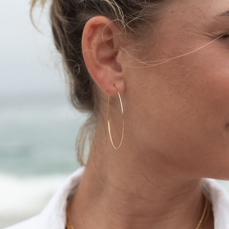 - 14k gold or silver filled lightweight wire hoops, measuring 2" in diameter.