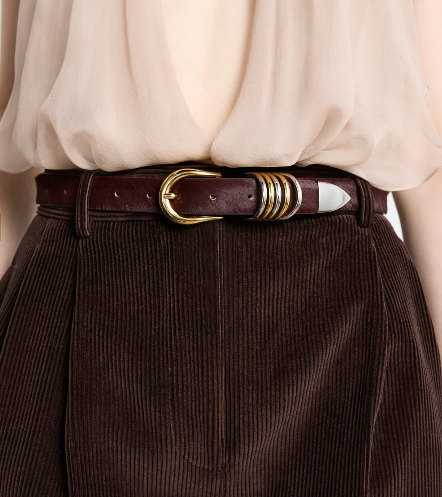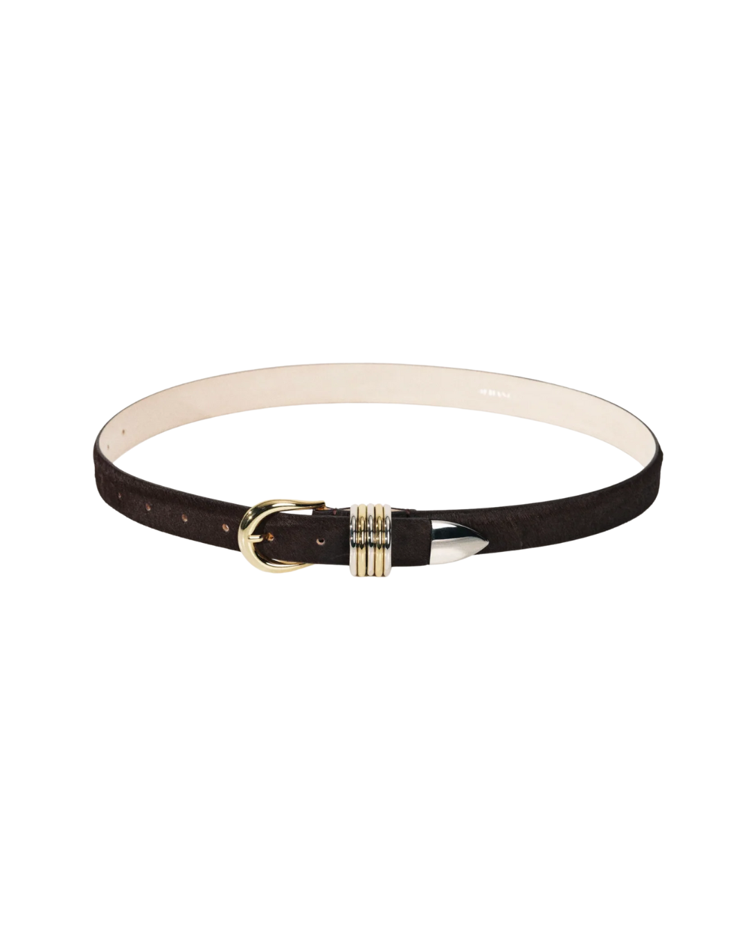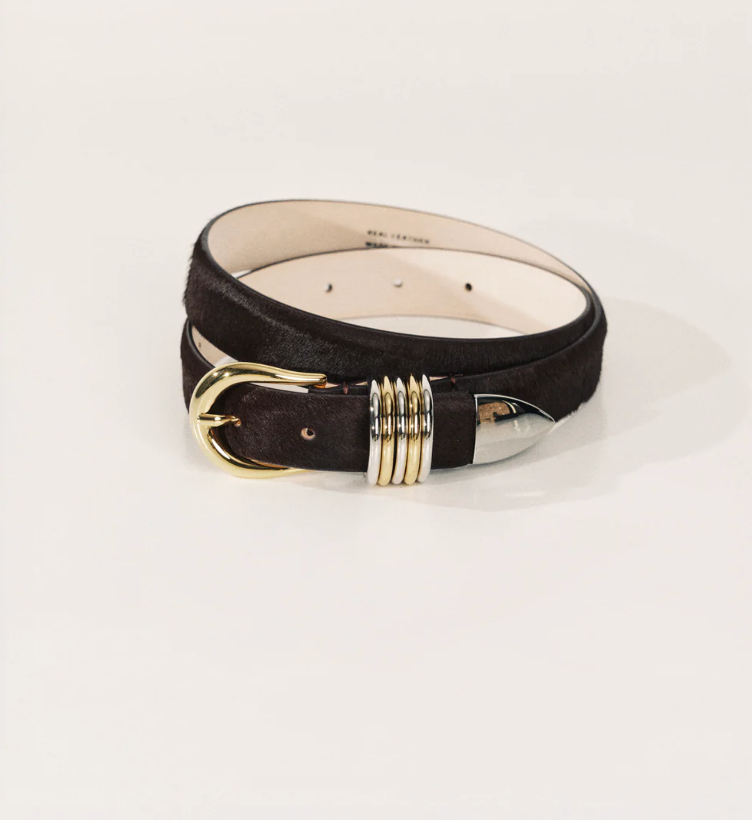 A signature style featuring 5 rings adornments with 10 holes and an extended strap length to accommodate a broader range of sizes. Meticulously crafted from Italian ponyhair and silver & 24K gold hardware.