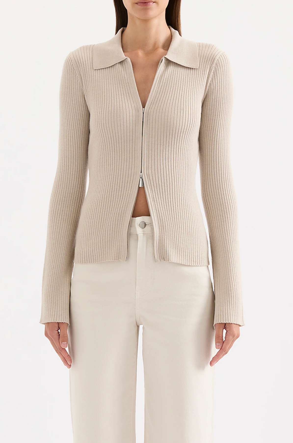 The Betina Zip Front Knit is made from a cotton blend yarn which has a ribbed, soft hand feel. The silhouette is fitted to the body with long, flared sleeves and length finishing above the hips. Features include knitted collar and a branded double ended zipper at centre front.