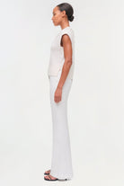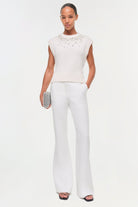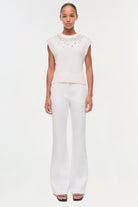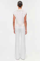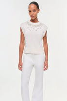 Knit from a soft wool cashmere blend, this sleeveless vest is structured with rib trims for shape. The neckline is hand-embellished with crystals and pearls, creating a luminous collar. A modern knit elevated with artisanal detail.