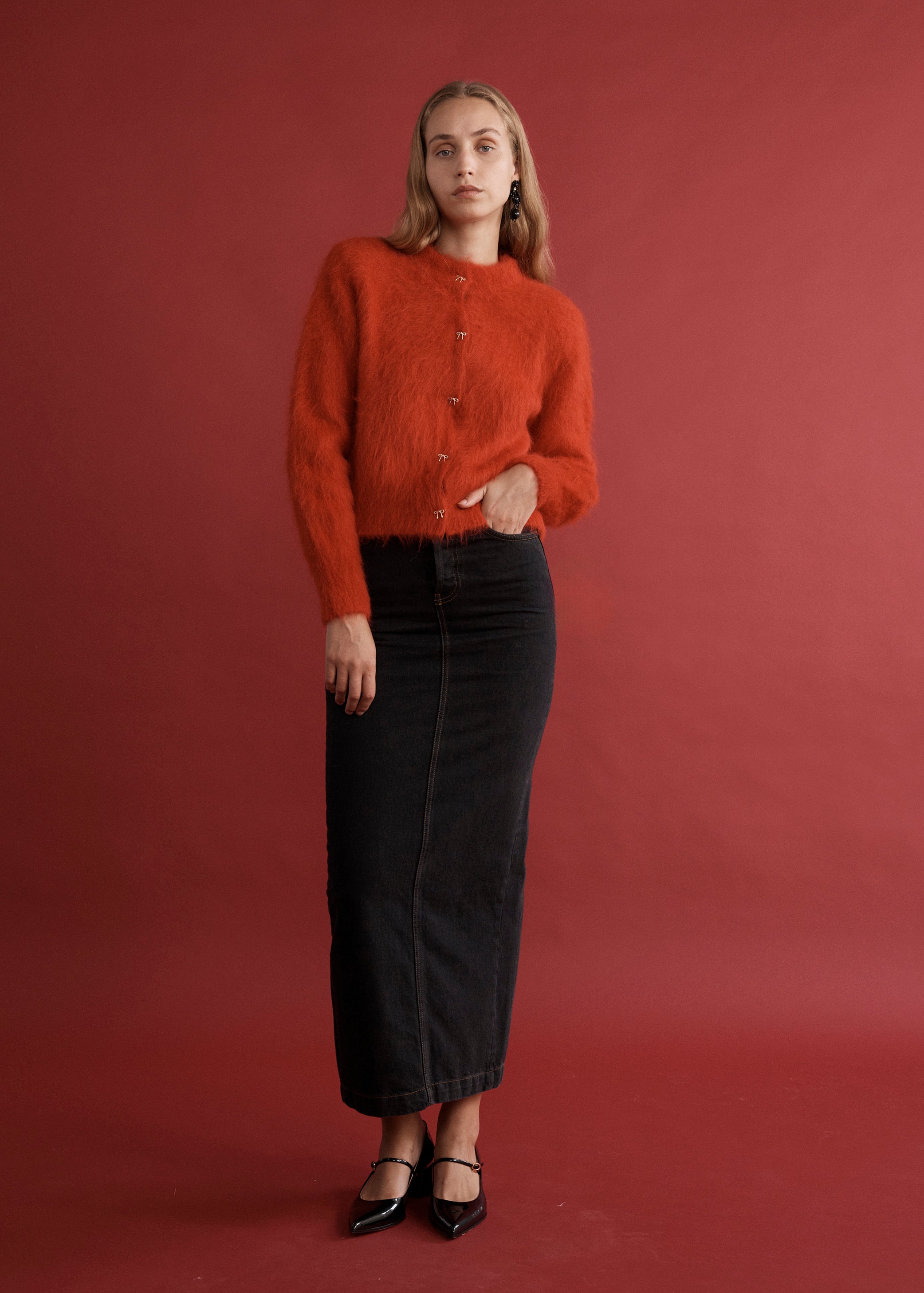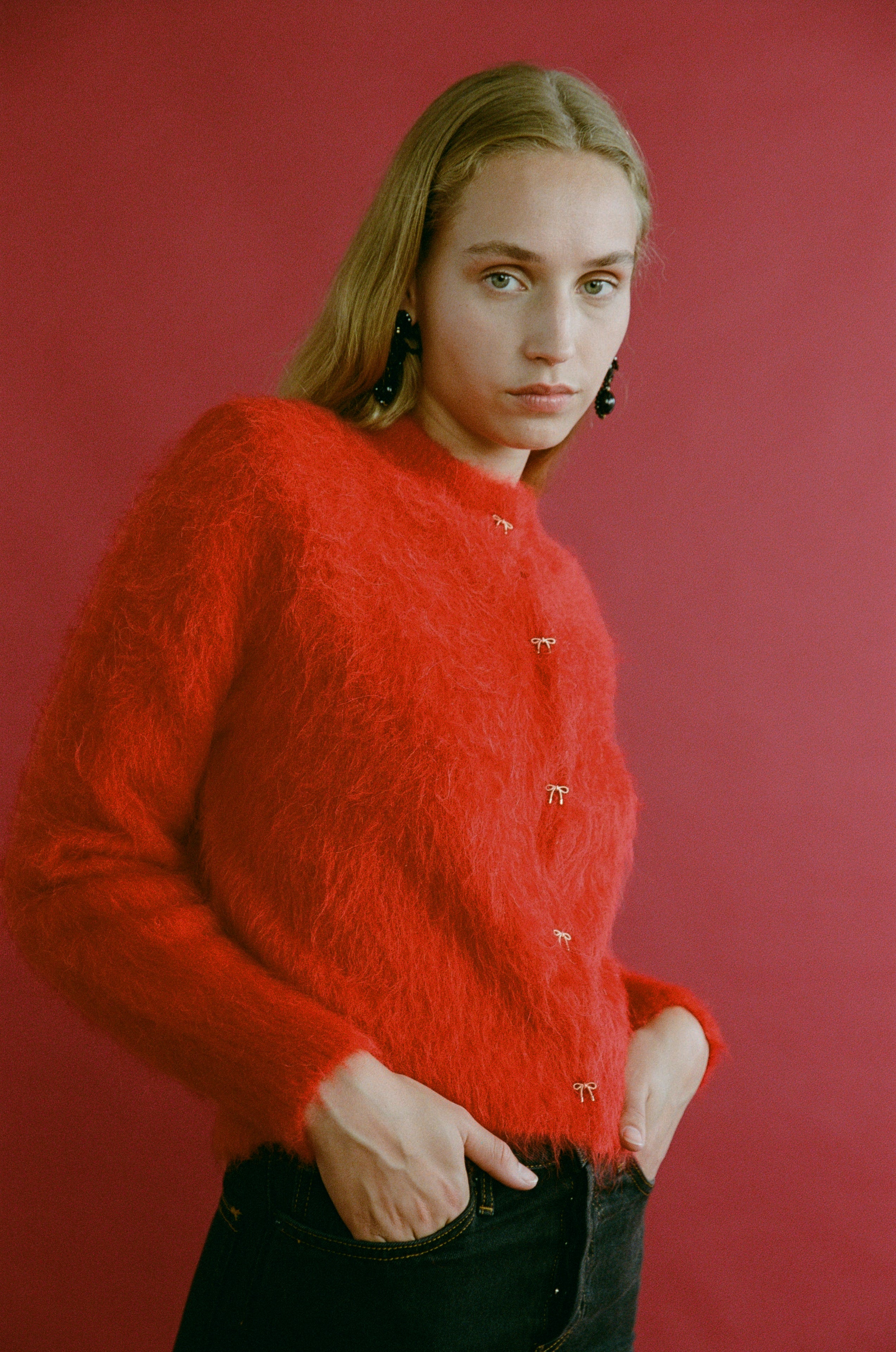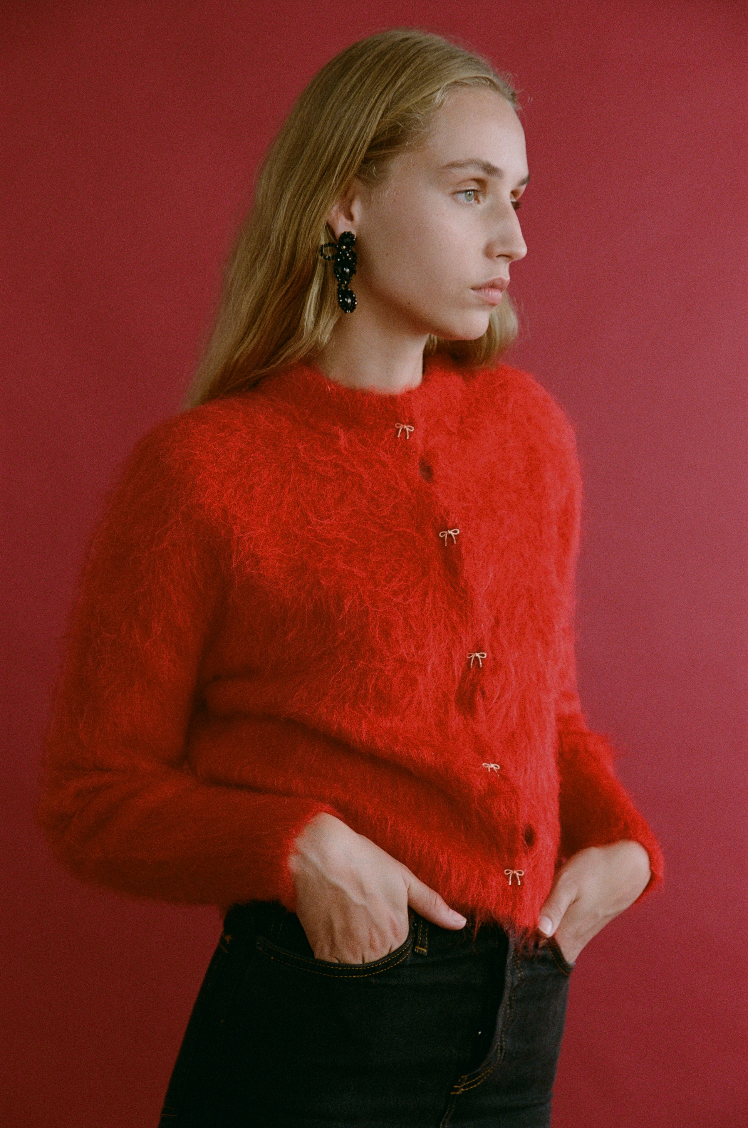 The Fleur Cardigan is a cozy, fluffy layer featuring elegant gold bow buttons that add a delicate touch. Wear it fully buttoned for warmth or open over a tee for a relaxed, stylish look. Perfect for everyday comfort with a charming twist.