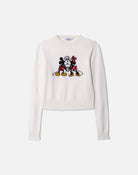 The debut of Disney | Re/Done. The classic cashmere crewneck pullover becomes the canvas for an intarsia of Mickey Mouse and Minnie Mouse sharing their most iconic moment. Nostalgic and playful, it's a heritage knit that bridges timeless Disney storytelling with Re/Done's lived-in sensibility.