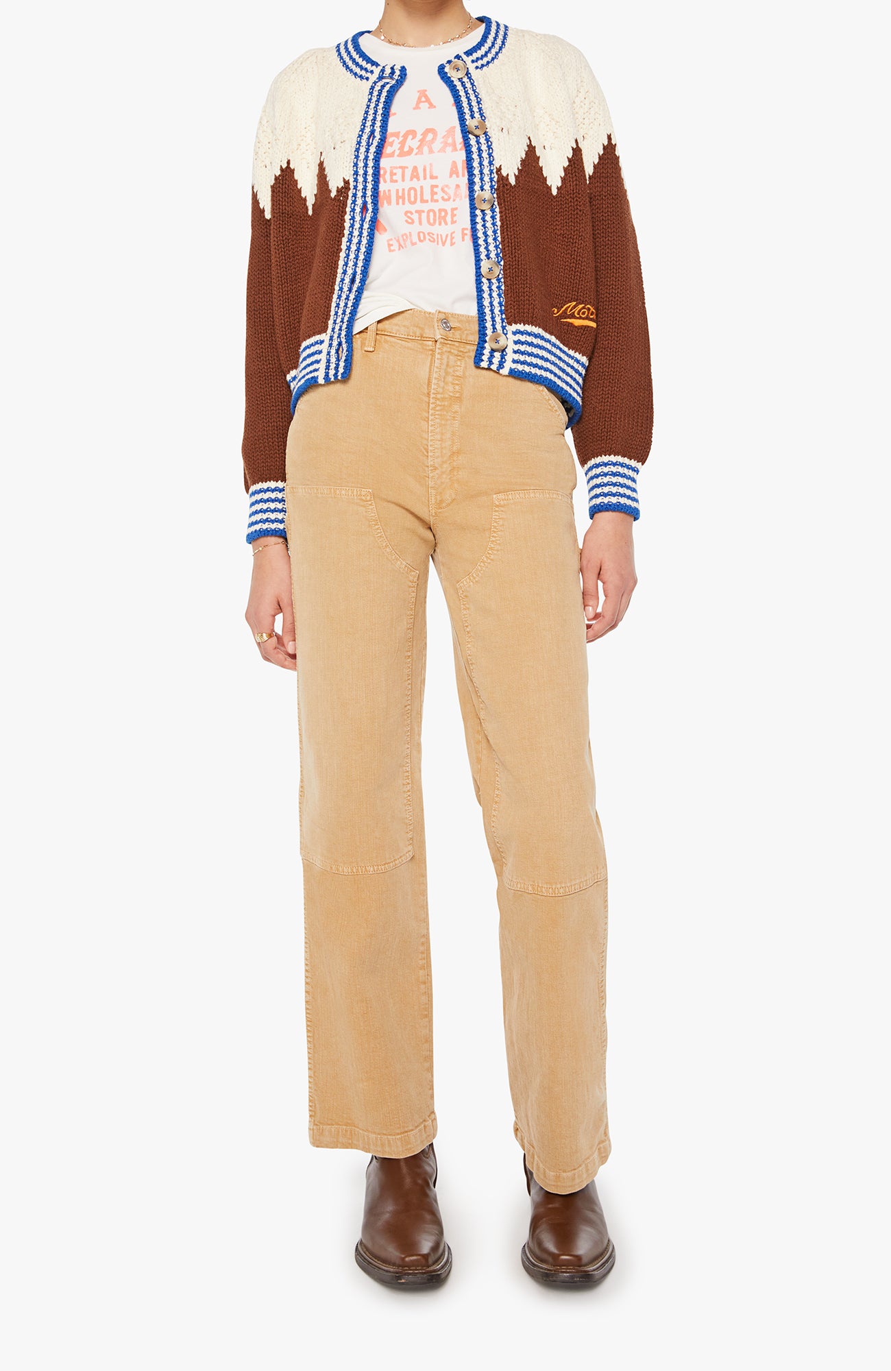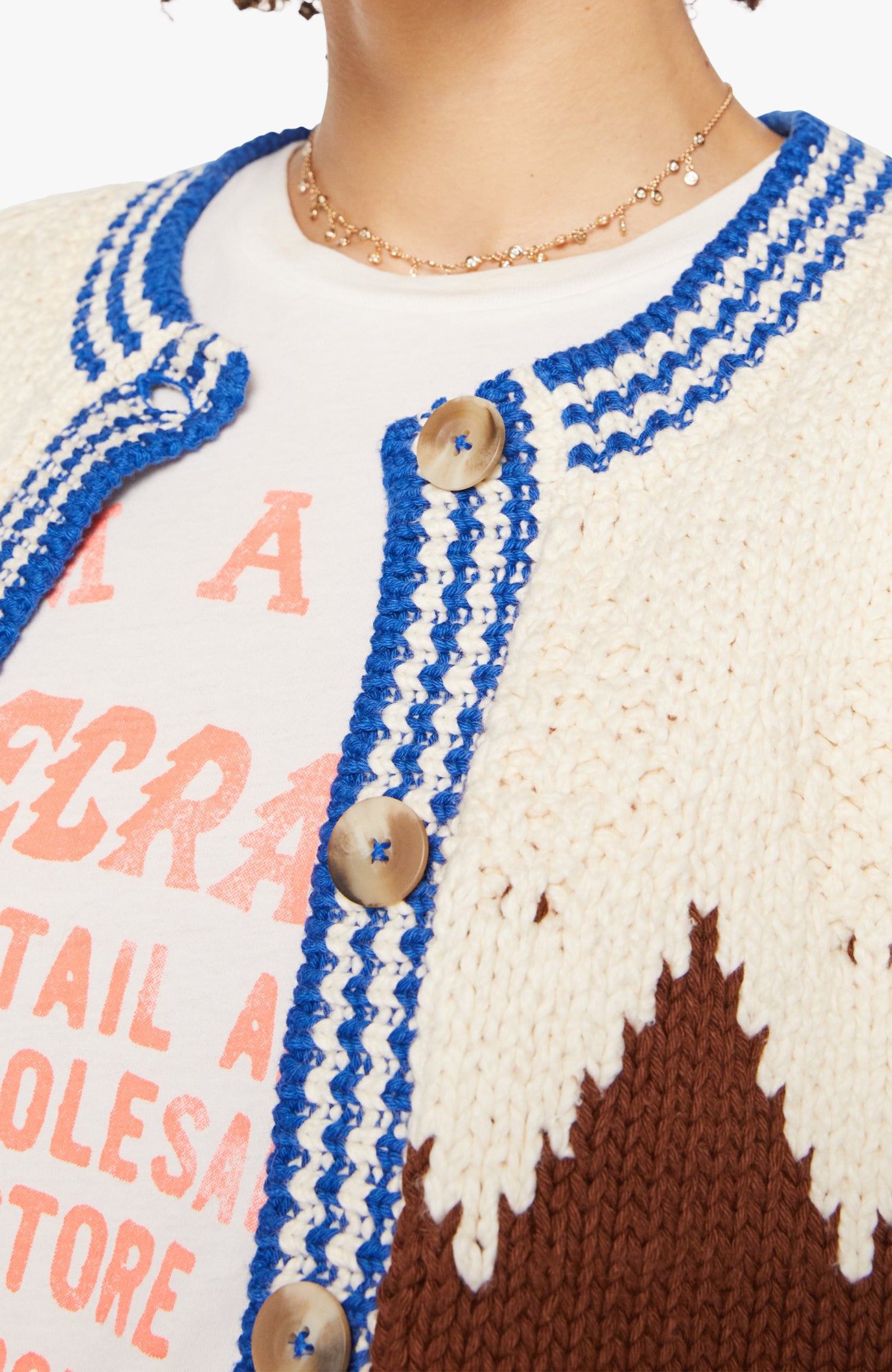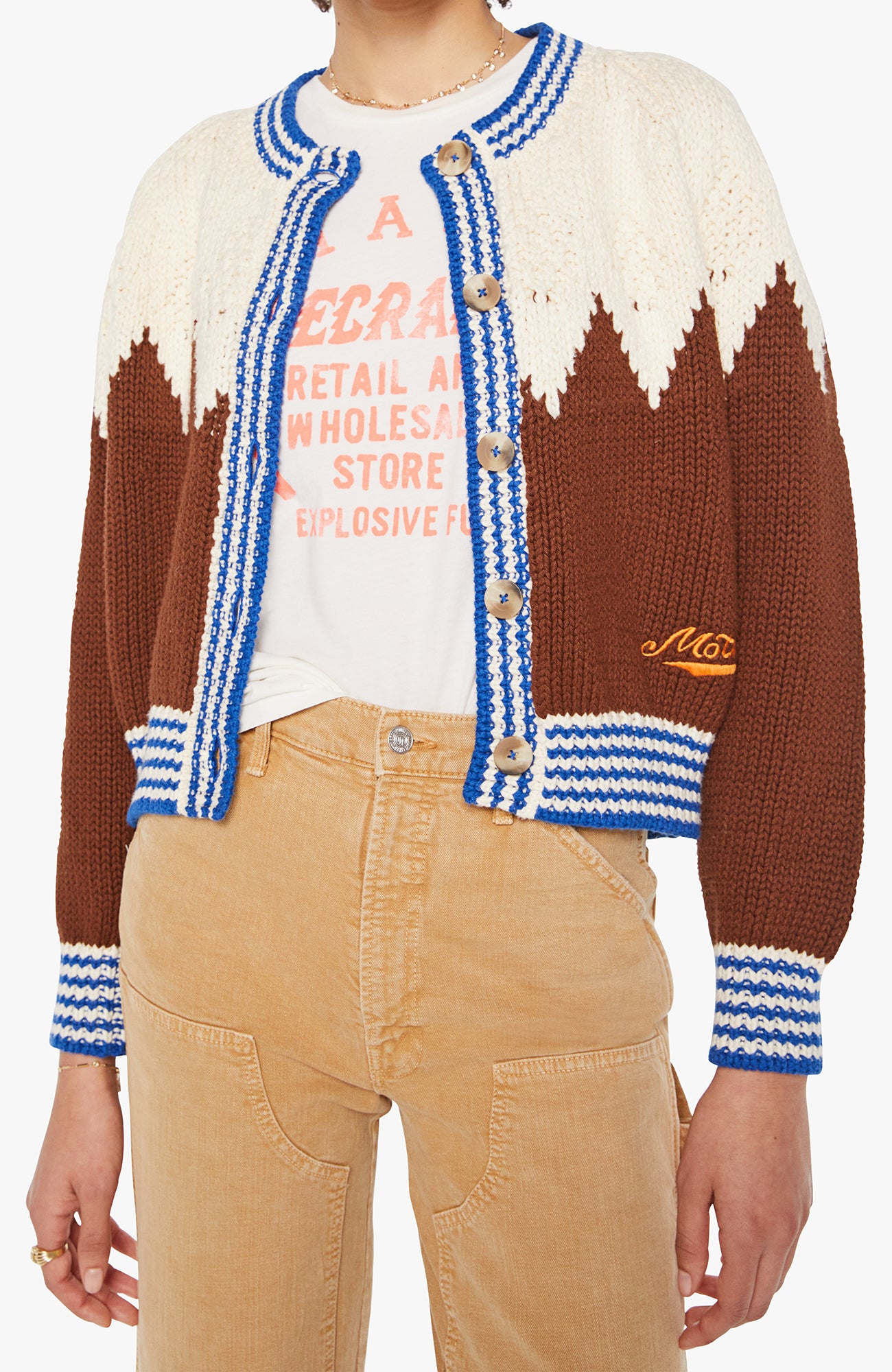 Take a hike. A raglan cardigan sweater with a crewneck and cropped hem. Made from 100% cotton, Head For The Hills is half cream, half brown with a zig-zag pattern and blue-and-white-striped hems.
