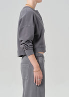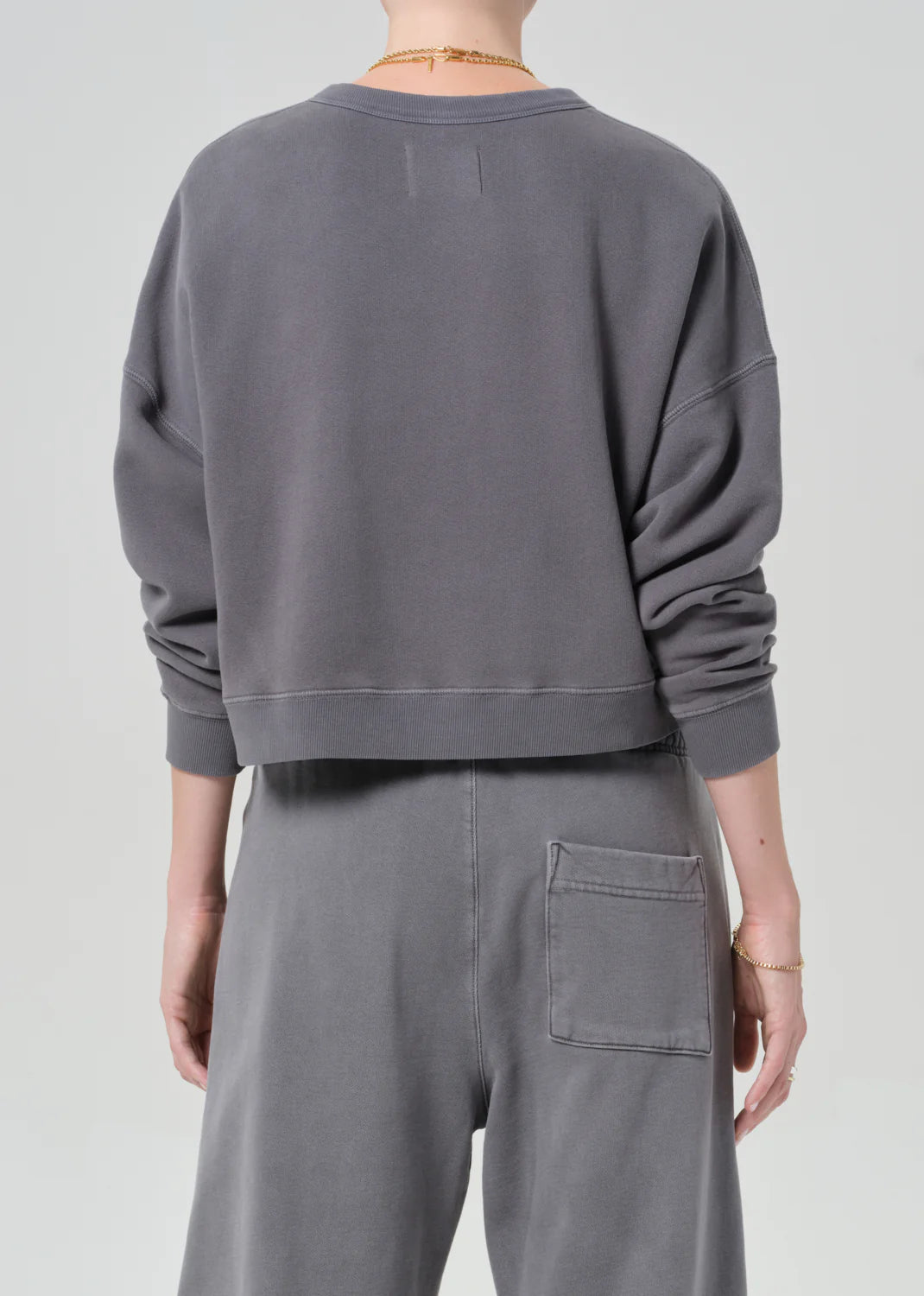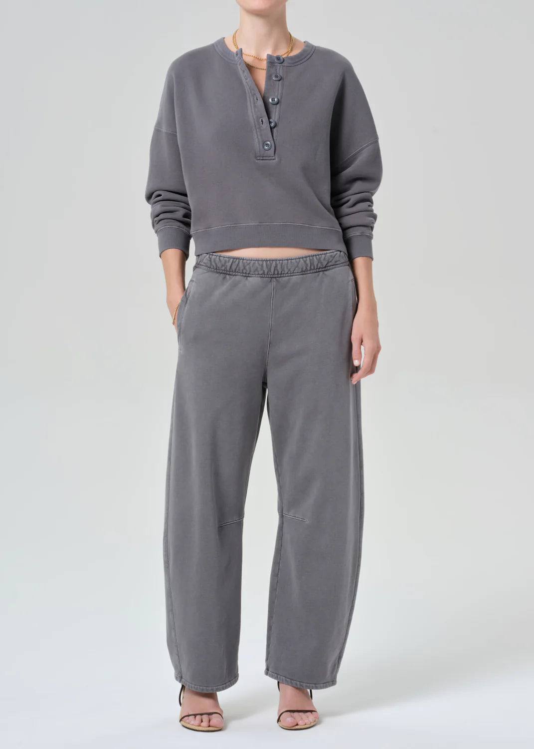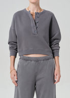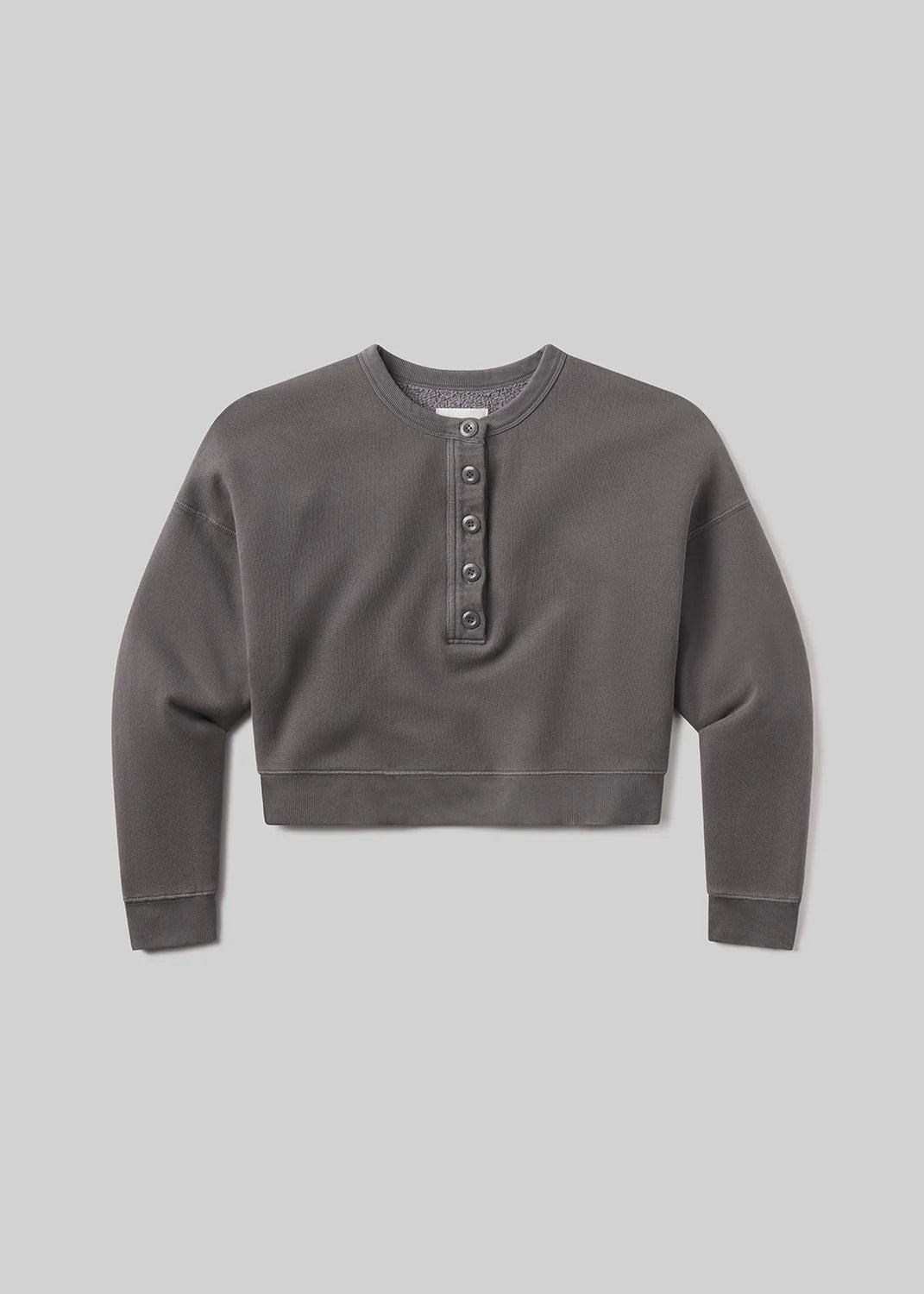 Looks Like: Medium to dark grey henley sweatshirt