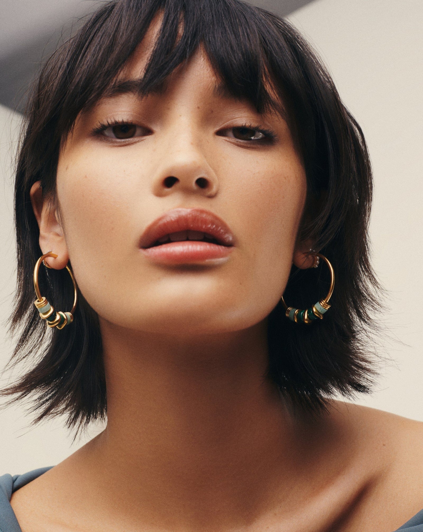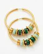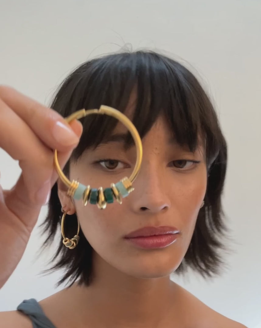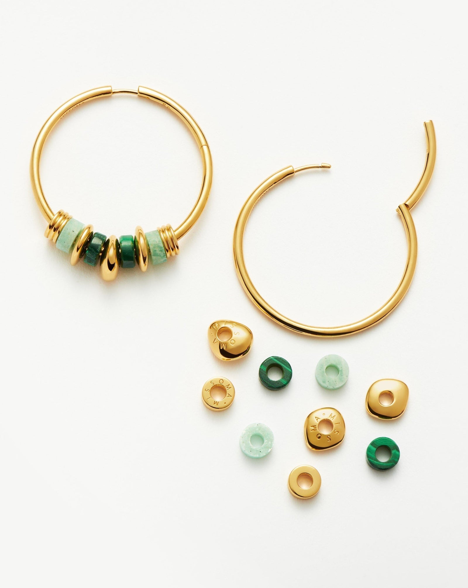 Jewelry you can count on. These extra large hoops feature a combination of removable gold and rounded gemstone beads with malachite – the transformation stone – and healing amazonite. Wear multiple ways by changing up the order of beads, or go for a maximalist look by stacking with your favorite studs and mini hoops. The removable beads can also be worn on your favorite chain.
