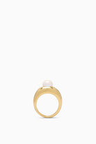 The Dina Ring is hand-forged by our artisan partners in Kenya from brass using a traditional sand casting technique—molten brass is heated in a kiln, hand-poured into a mold made of sand, and then hand-shaped into this elegant ring. A single freshwater pearl adorns the center.