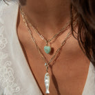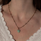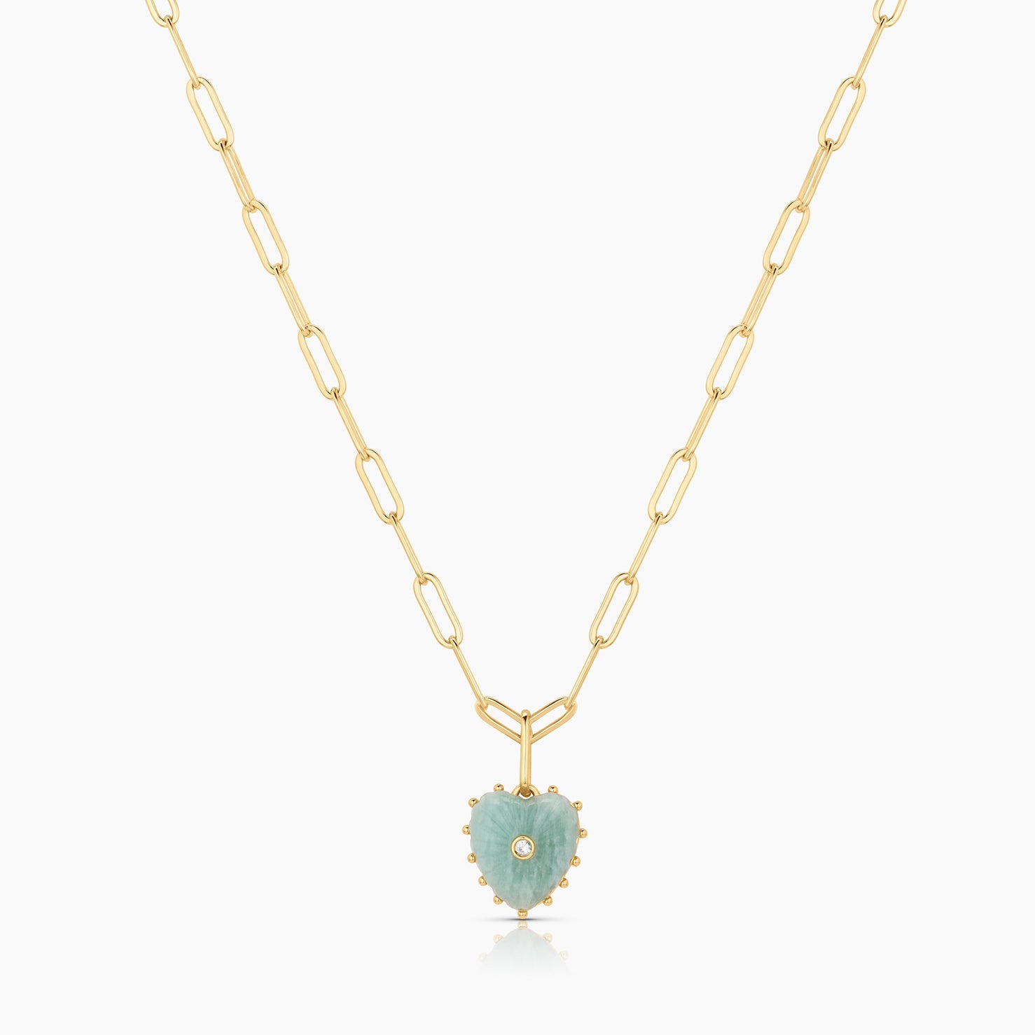14k gold plated carved amazonite heart charm with cubic zirconia on 3.4 mm Finn medium elongated chain necklace. Fully adjustable up to 18".