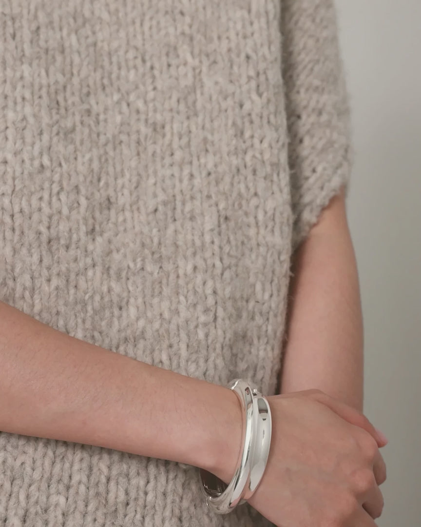 An organically-shaped bangle that boasts deep contours. This custom bracelet opens and closes with a hinge and tab lock closure. To open, push down on the highest point of the clasp before pulling the bracelet open. To close, listen for a "click" to ensure tab is locked properly. Finished in high-polish silver.