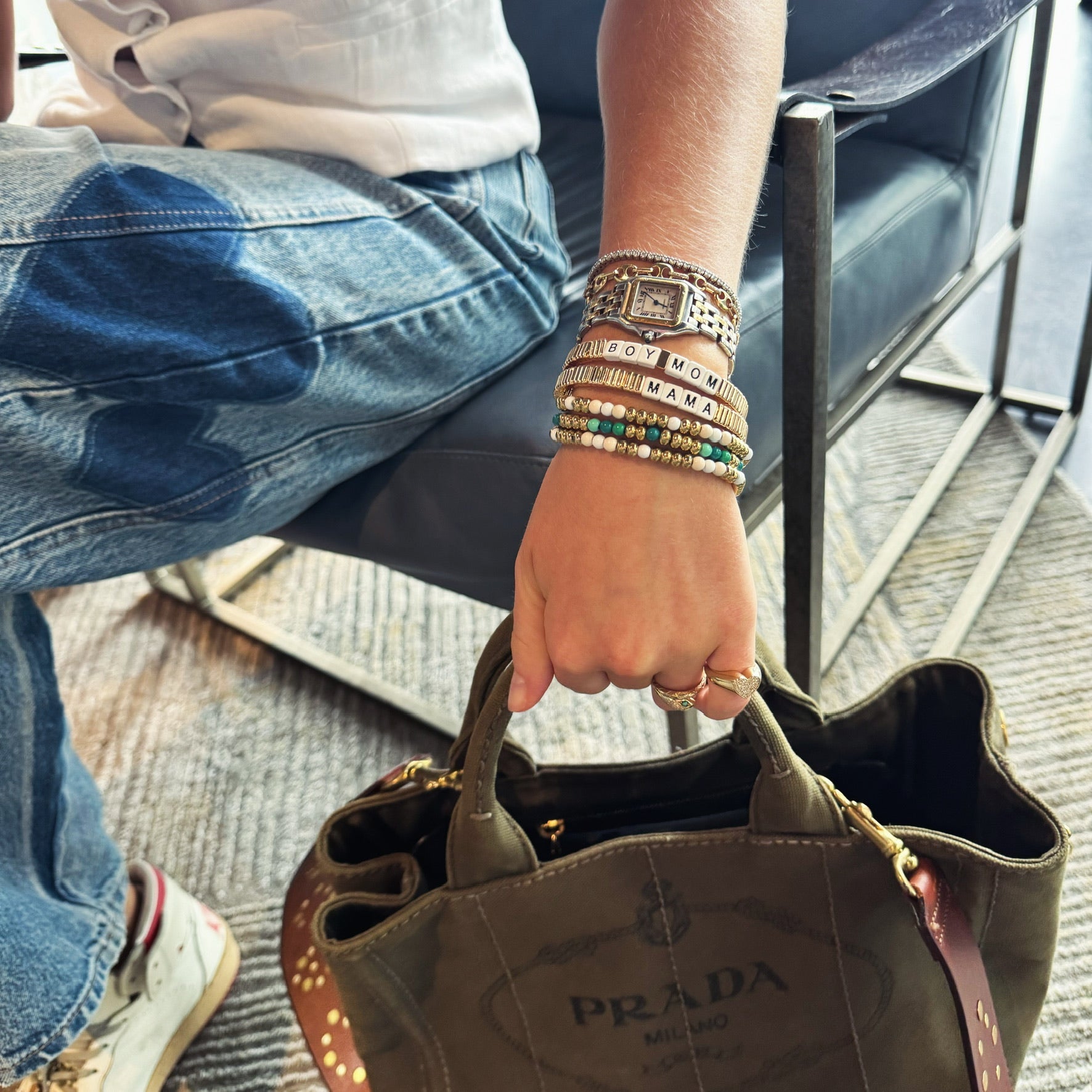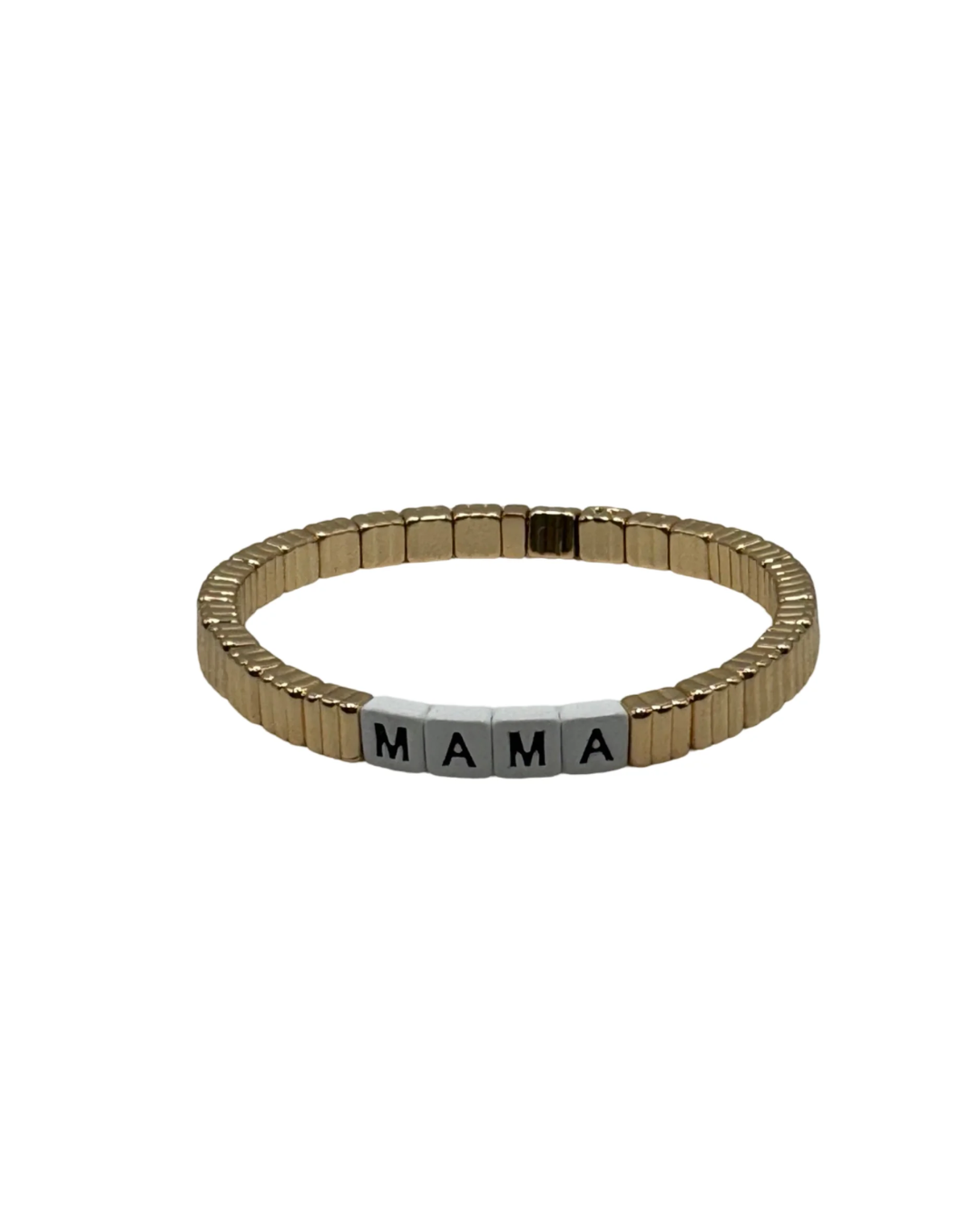 The Mama Gold Line Bracelet features textured gold beads in a thinner, more petite size with the word "MAMA". Perfect gift's for Mother's Day, Moms to be or just because! Each bracelet is 7" in length, 7MM bead diameter and is a slip-on-style. All of the single bracelets are designed to be stacked or they can be styled to wear alone.