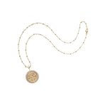 • Coin pendant made of sterling silver dipped in 14k gold and surrounded by white topaz stones, measuring 1.25" in height, 1" in diameter.