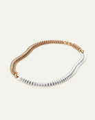 A gorgeously fluid choker (that doubles as a bracelet) with a ribbed texture through a unique caterpillar construction. A removable short chain extender allows you to find your preferred fit. Wear it with a single tone at the front of your chest, or half and half, with a flash of each finish at the front of your chest. Vintage-inspired foldover closure, finished in high-polish gold and silver. To wear as bracelets, simply open both of the closures and wear the chains on your wrist.