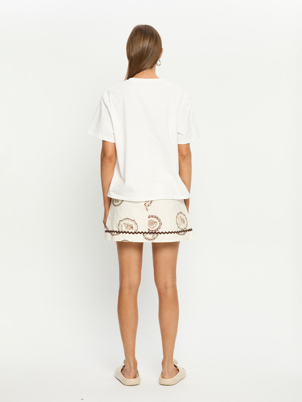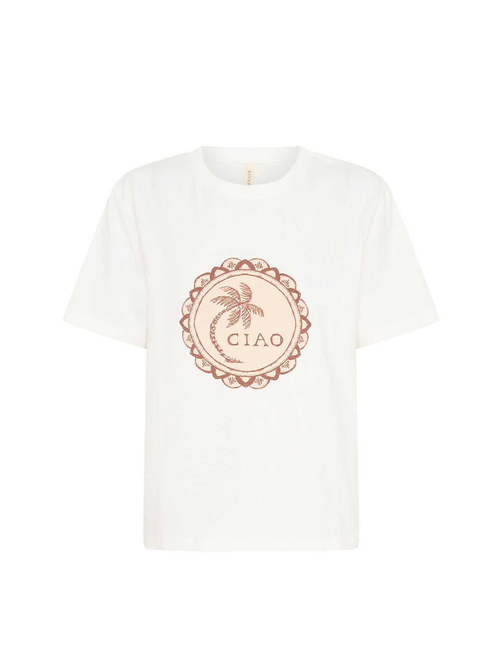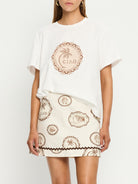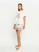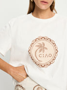 Ciao is hand sketched shells and coastal inspired stamps on a soft ivory base. The Ciao Tee is a relaxed silhouette featuring a round neck with ribbed detailing, short sleeves, complete with a vintage inspired design.