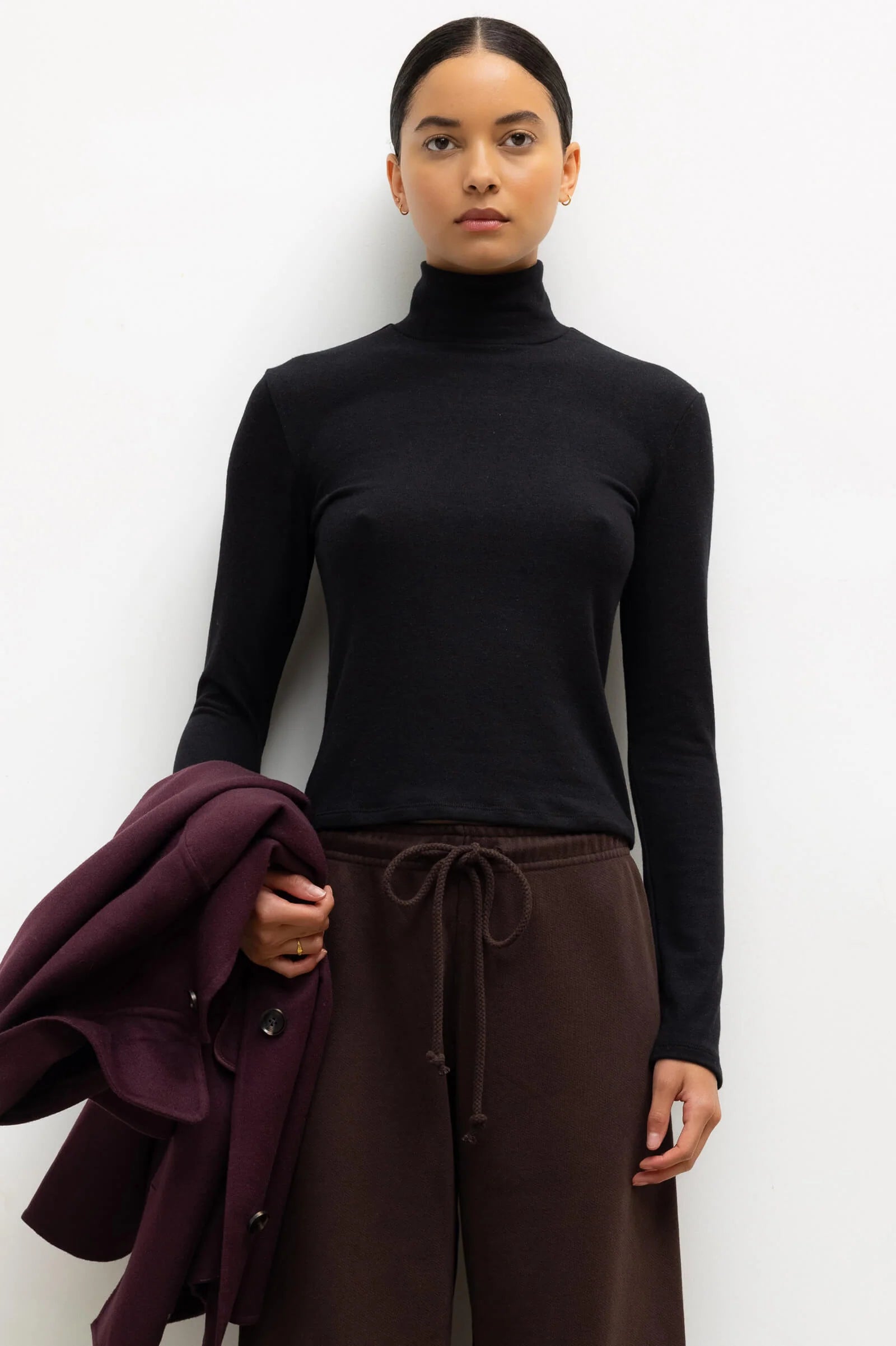 Cut in our buttery soft brushed sweater jersey, The Lauren Long Sleeve Turtleneck is a fitted silhouette with full length sleeves and a flexibly styled turtleneck.