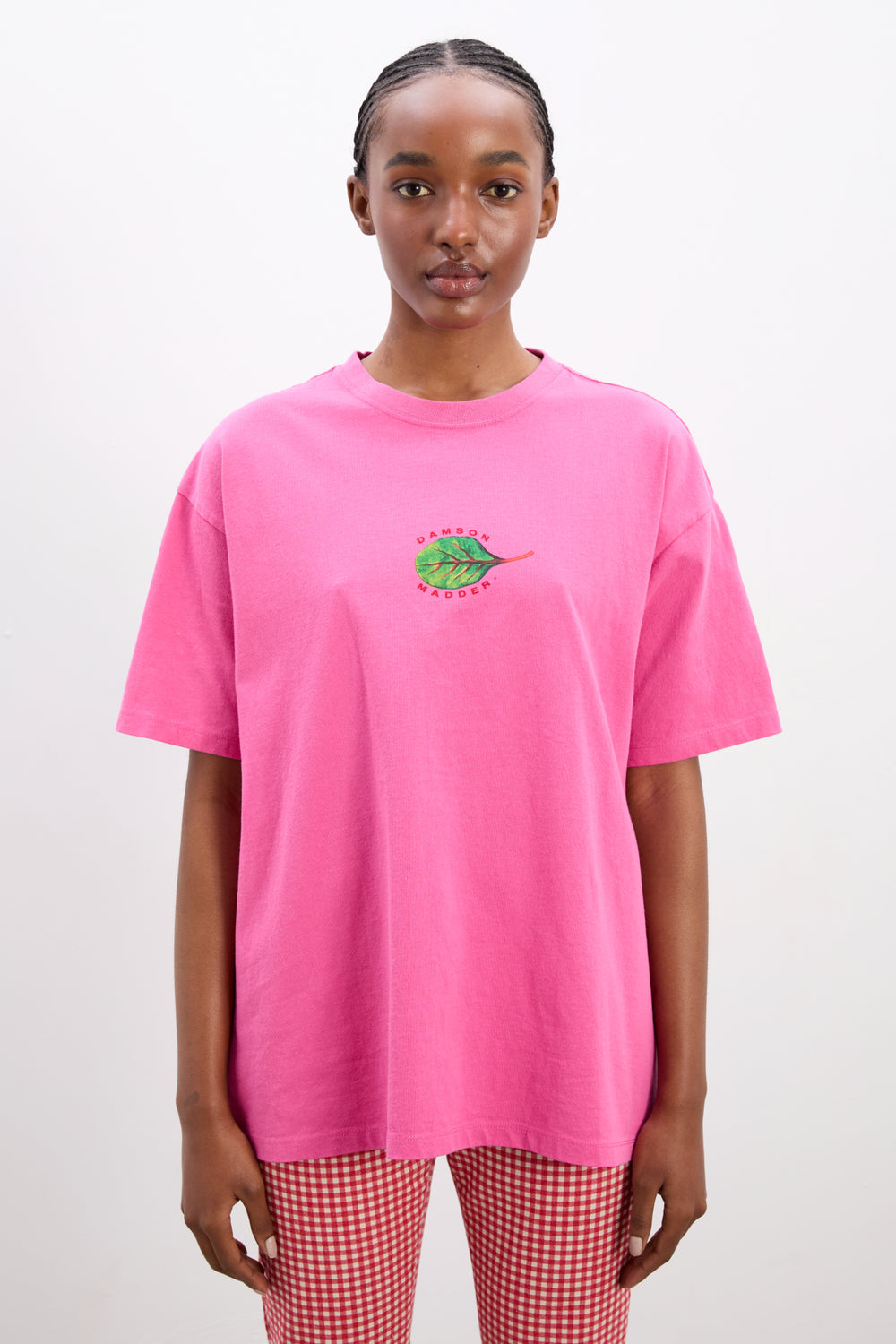 The Salad Boyfriend Tee in pink, made from 100% organic cotton, is cut to a boyfriend fit for a relaxed look. Complete with unique DM salad graphics custom drawn by our creative director.