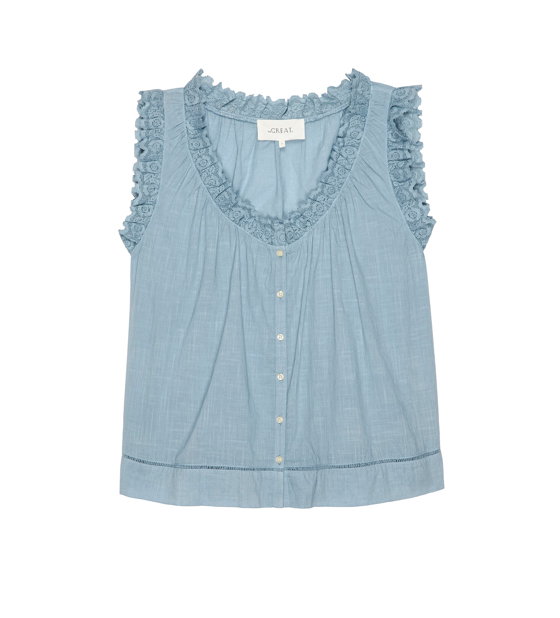 The Vignette Top offers a flattering boxy fit with sleeveless comfort, enhanced by delicate ruffled lace trim for a touch of elegance. Its button-up design allows for easy wear and versatile styling, making it a perfect choice for both casual and dressier occasions. Enjoy a blend of comfort and feminine detail that supports your everyday wardrobe needs.