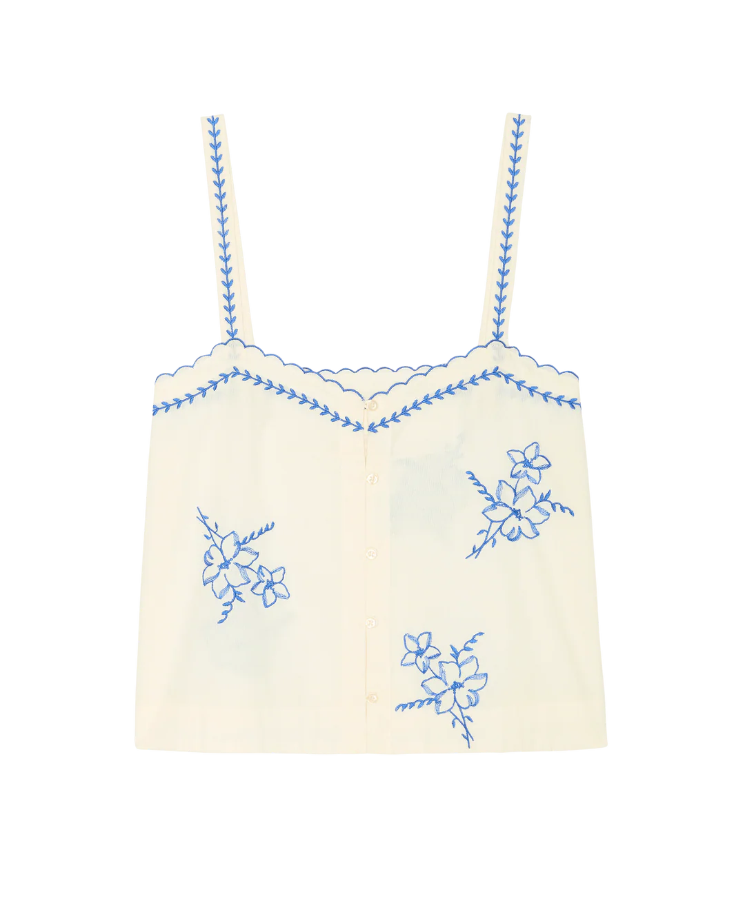 A horizontal chest dart adds subtle shape, while adjustable shoulder straps allow for a personalized fit. Designed with heirloom handkerchief details—scalloped edges and delicate floral embroidery—it carries a sense of nostalgia and craftsmanship.