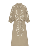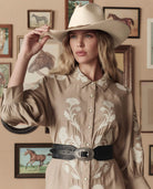 Designed in a classic shirtdress silhouette, the Western Embroidered Herd Dress features dramatically billowed sleeves, double-needle stitching details, a shirt collar with a button placket, and a long sash meant to wrap twice around the waist. This season, it’s made in collaboration with Stetson and crafted in a soft, drapey rayon twill with a delicate chain-stitched Western floral motif inspired by vintage Western designs sourced over the years.