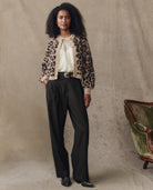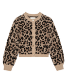 Classic with a twist, this cropped cardigan is spun from a lofty alpaca blend and knit with a bold leopard jacquard in a playfully oversized scale this versatile sweater is finished with blouson sleeves and light horn buttons.