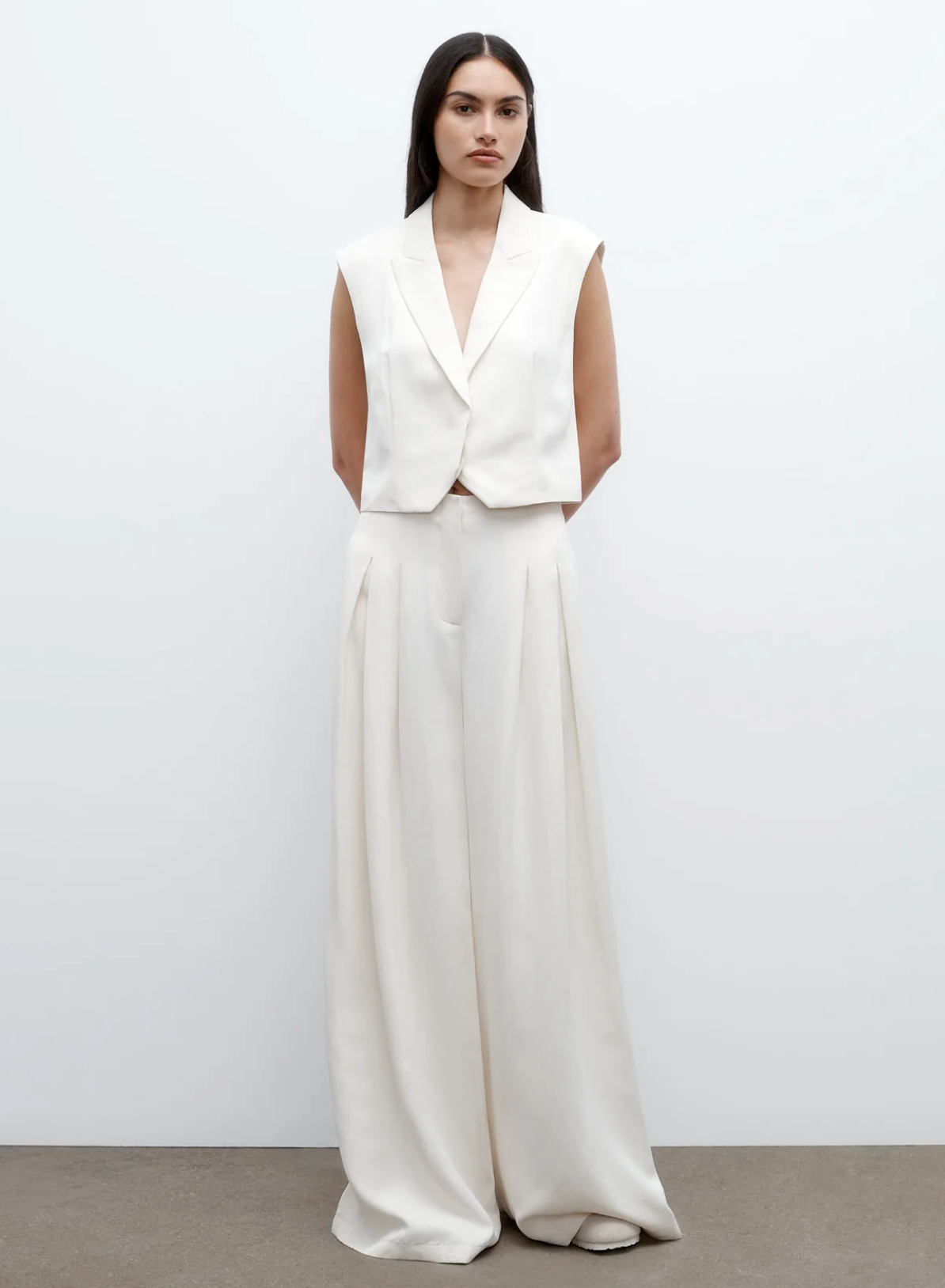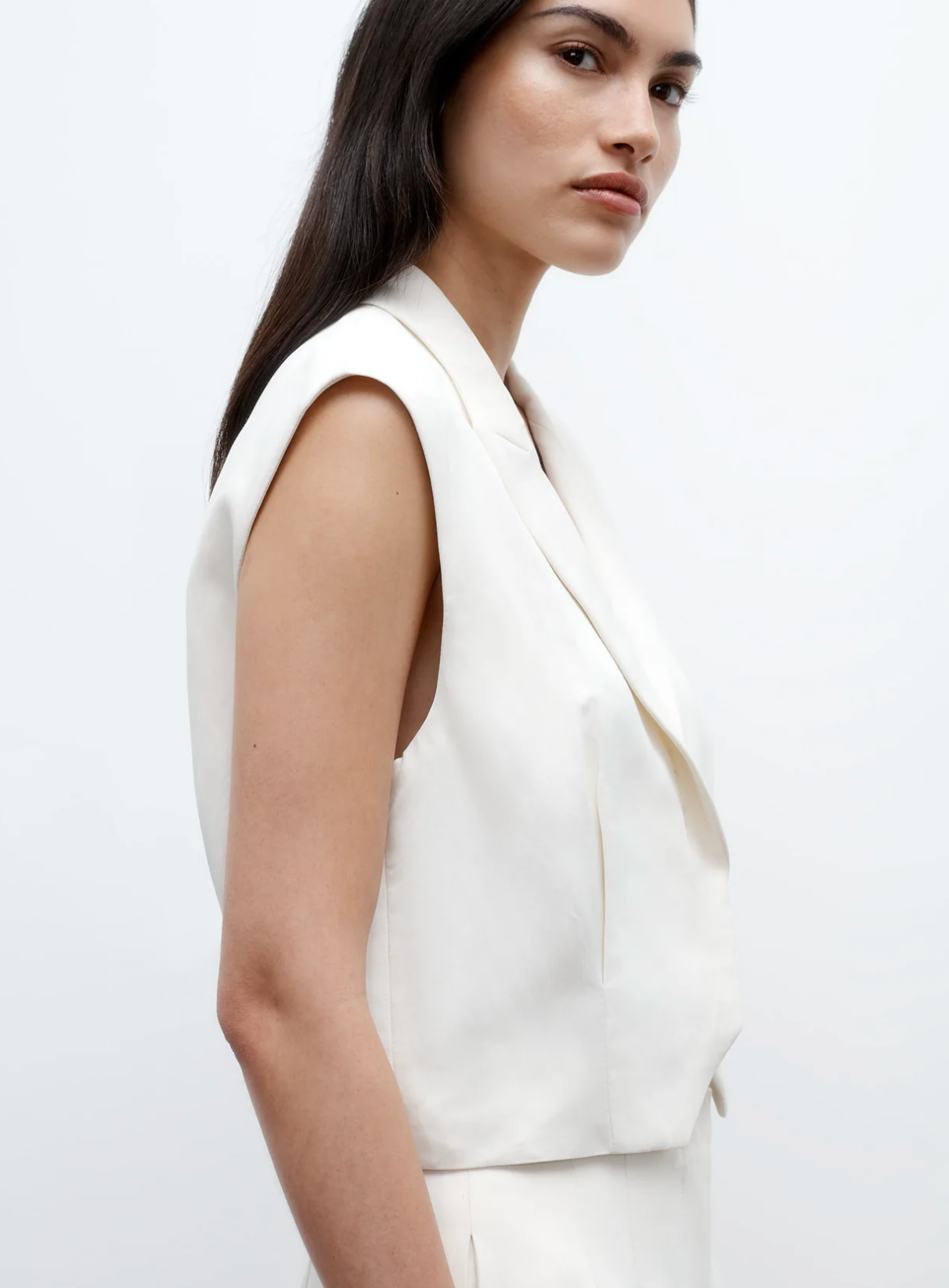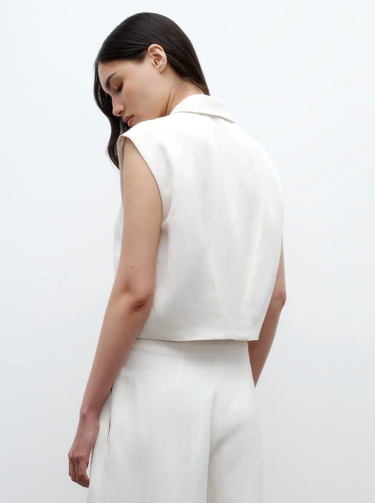 Cropped suit vest in coated viscose linen. We combined a European flax linen, and viscose coating, creating a fabric with a deep color saturation, elegant drape and satiny sheen. The Katie Vest is a boxy fit with inverted pleats at the back. Complete with a concealed placket, peaked lapel and side darts.