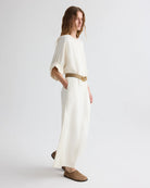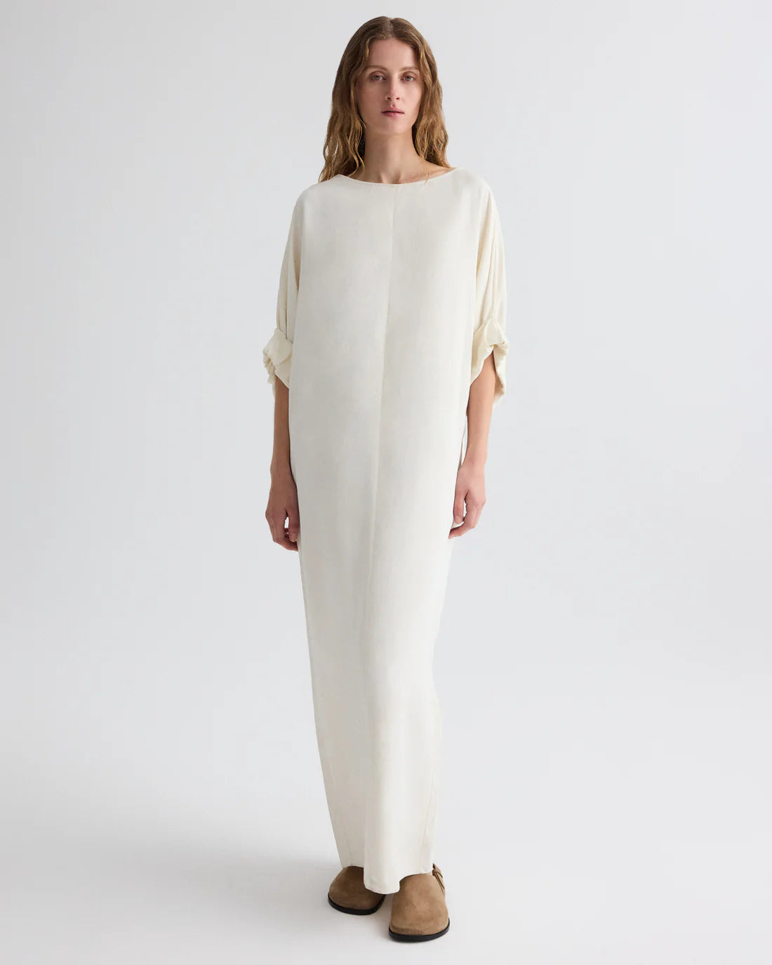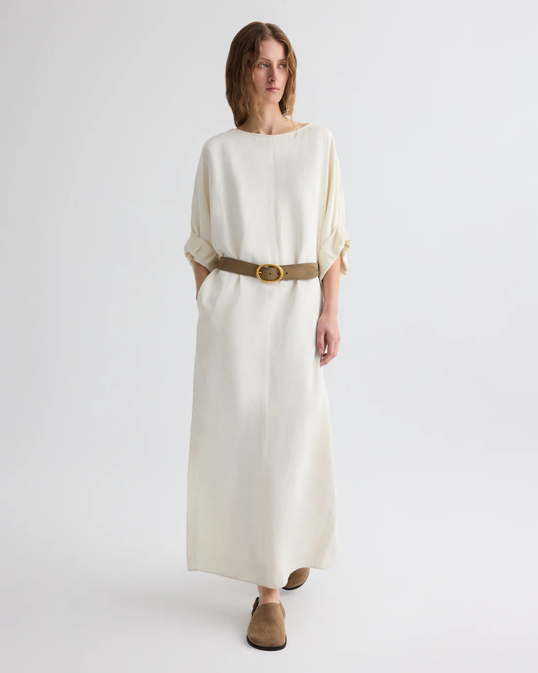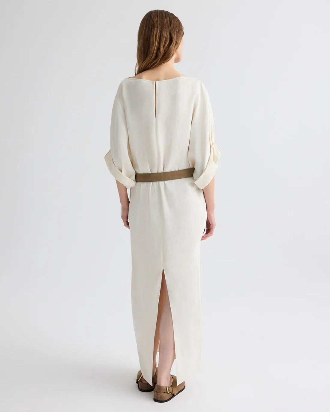 Boat neck maxi dress in coated viscose linen. Fabric combines European flax linen with a viscose coating, creating a material with deep color saturation, elegant drape, and a satiny sheen. The Dress for B features a relaxed, column silhouette with softly gathered sleeves that taper at the elbow. Finished with side pockets, a back slit, and a keyhole opening at the back neck.