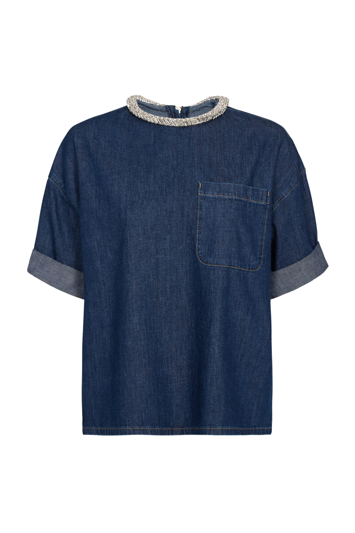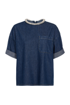 Cropped, short sleeved, mock neck top in natural Japanese denim, embellished with a prong set crystal collar. The Ex T is a boxy silhouette. Complete with a chest patch pocket, turned up cuffs and zip at the back.