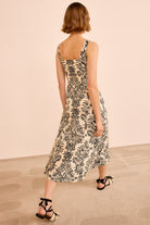 Crafted from signature poplin, the Natali Dress is a timeless, yet distinctive piece adorned with a symmetrical floral leaf print with subtle, batik textures. This black and ivory dress has a square neckline that echoes the ‘90s and a midi-length hem.
