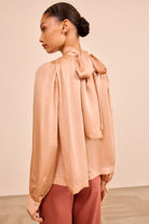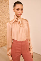 The Ornament Blouse is impeccably cut from lightweight, satin-finished chiffon steeped in a soft shade of pink. This billowing top embodies graceful elegance with a high neckline and ties that fasten at the front or the back.