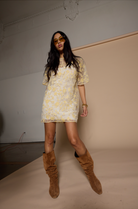 FLOWER BEADS BOXY DRESS YELLOW PRINT FEATURES A FLORAL BEAD EMBROIDERY DESIGN WITH A RELAXED, BOXY SILHOUETTE AND SHORT SLEEVES. THE DRESS SHOWCASES THE SAME INTRICATE PATTERN THROUGHOUT, OFFERING A COHESIVE LOOK.