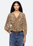 The Claude leopard print top features detailed pleating and a self-tie belt, adding both texture and shape to its flattering silhouette. The button-down front and long puff sleeves are complemented by the bold animal print, making it the perfect blouse to transition from day to night.