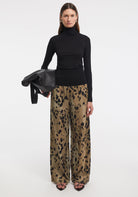 Our CRUST pants are made of a sustainable FSC-certified viscose and silk blend, adorned with our ocelot print. Cut to a relaxed, wide-leg silhouette, they feature an elasticated waistband for effortless comfort and subtle back welt pockets for a polished finish. Pair them with the matching DEW turtleneck or wear them with a contrasting top for a bold yet refined statement.