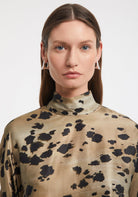 Our DEW turtleneck is made of a sustainable FSC-certified viscose and silk blend, adorned with our ocelot print. Designed with a high neckline and a relaxed silhouette, it features an adjustable drawstring at the waist for a personalized fit. This piece offers both fluidity and statement appeal, perfect for layered sophistication with the matching CRUST pants or worn on its own as a dress.