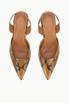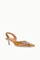 The Sebastian is a slingback kitten heel with a pointed toe, updated in our seasonal embossed snake print.
