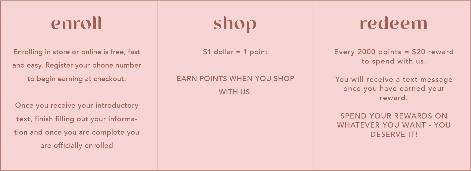 CLAIRVAUX REWARDS is a free loyalty program designed to reward our most loyal clients. Our rewards program provides you with shopping benefits, private invitations, and special offers. Discover and unlock your points with every purchase.