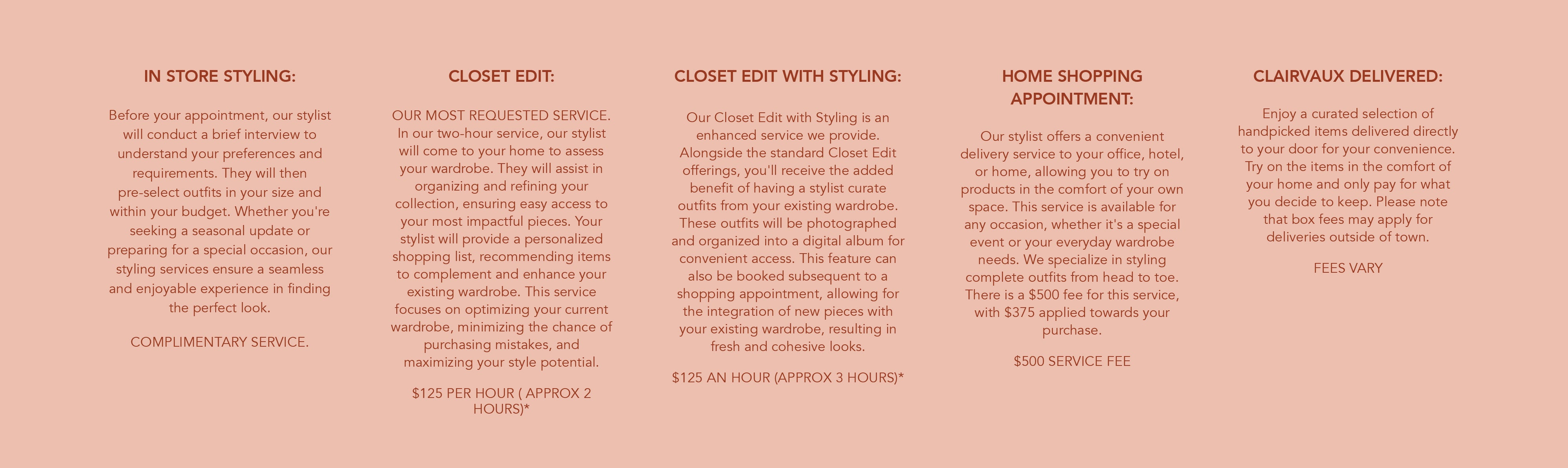The Services is a list of customized appointments that help better serve individual styling needs. From Closet Cleanouts to In-Home Styling Appointments, Clairvaux wants to help every client create a wardrobe that works for their lifestyle.