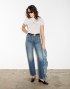 Inspired by our best selling iconic Levi's 90s jean, reimagined in a medium dark stone wash on Italian indigo fabric. Features a stick straight leg with a slight pinch at the waist. Showcases curve hugging darts over the back yoke, classic button fly and finished hem.