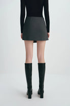 Asymmetric wool-blend mini skirt with tailored fit and modern edge, designed for refined structure and versatile polish.